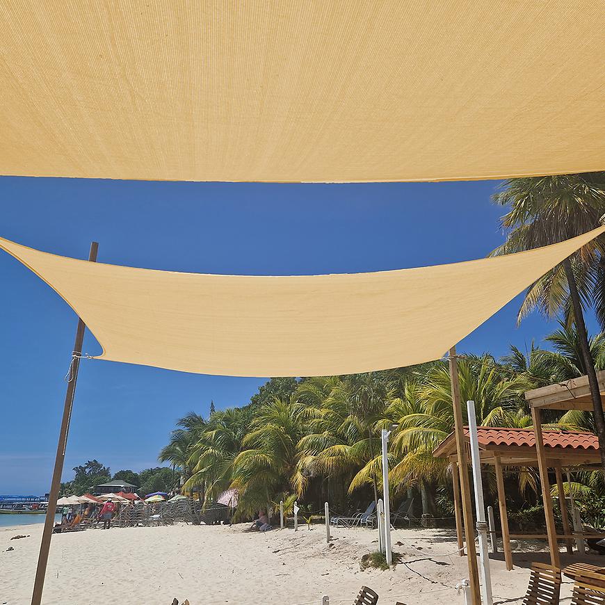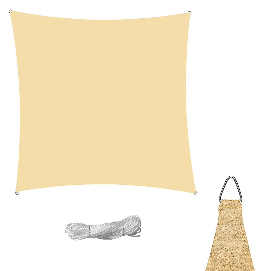 Kwadratowy żagiel cieniujący o wymiarach 3,6 × 3,6 m w eleganckim, beżowym kolorze to stylowe i funkcjonalne rozwiązanie idealne na taras, balkon czy do ogrodu. Wykonany z oddychającej tkaniny polietylenowej.