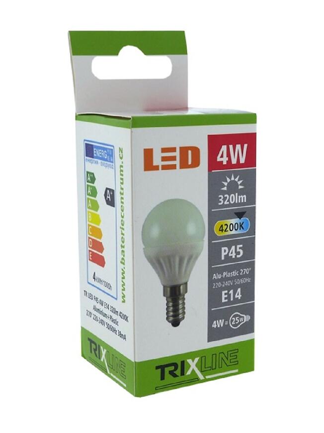 Żarówka BC 4W TR LED E14 P45 320LM 4200K-PLASTIC to praktyczne źródło światła LED o neutralnej barwie 4200K, zapewniającej jasne, naturalne oświetlenie. Jej moc wynosi 4W, a strumień świetlny 320 lm gwarantuje komfortowe światło do codziennego użytku. Wyposażona w gwint E14 i kąt świecenia 300°, nie posiada funkcji przyciemniania ani możliwości zmiany kierunku światła. Klasa efektywności energetycznej: G, żywotność około 30 000 godzin. Wskaźnik oddawania barw ≥80 zapewnia wierne odwzorowanie kolorów. Wymiary żarówki: 7,8 × 4,5 cm. Idealna do lamp stołowych, kinkietów i małych opraw oświetleniowych.