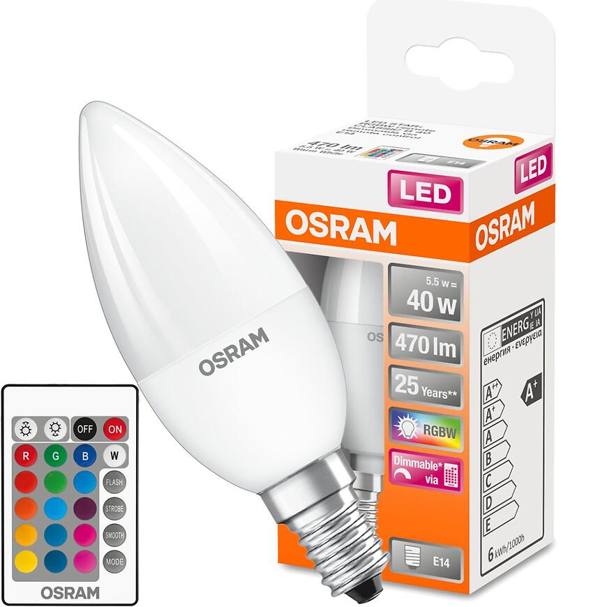 Żarówka LED OSRAM RGB z gwintem E14 i kształtem B35 o mocy 4,9W, oferująca pełną gamę kolorów światła RGB sterowaną pilotem. Dzięki możliwości przyciemniania i zmiany barw światła jest idealna do tworzenia nastrojowego oświetlenia w domowych wnętrzach. Żarówka zapewnia strumień świetlny 470 lumenów, łączy nowoczesną technologię LED z wygodą sterowania i efektownym designem.