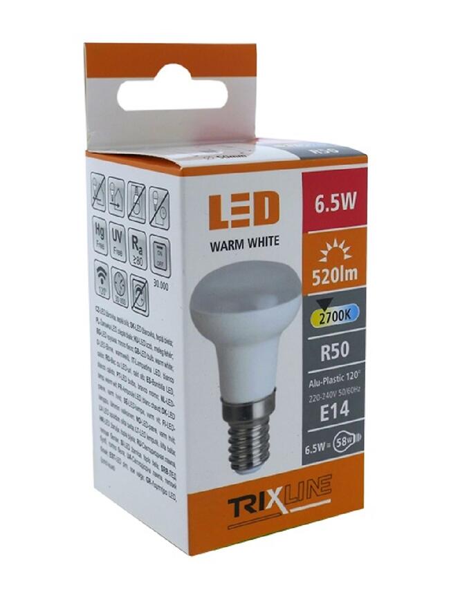 Żarówka LED R50 o mocy 6,5W z gwintem E14 emituje ciepłe światło o temperaturze barwowej 2700K i strumieniu świetlnym 520 lm. Nie jest ściemnialna, posiada kąt świecenia 120° i klasę efektywności energetycznej G. Jej żywotność wynosi 30 000 godzin, a wskaźnik oddawania barw (Ra) to ≥80. Idealna do punktowego oświetlenia wnętrz.