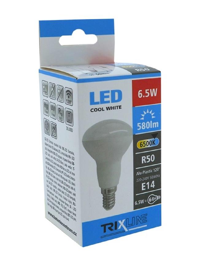 Żarówka LED R50 o mocy 6,5W z gwintem E14 emituje zimne światło o temperaturze barwowej 6500K i strumieniu świetlnym 580 lm. Nie jest ściemnialna, posiada kąt świecenia 120° i klasę efektywności energetycznej F. Jej żywotność wynosi 30 000 godzin, a wskaźnik oddawania barw (Ra) to ≥80. Idealna do punktowego i mocnego oświetlenia wnętrz.