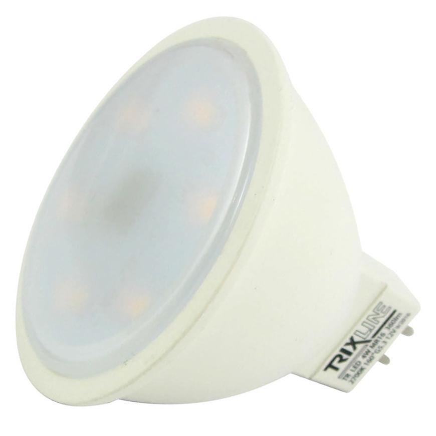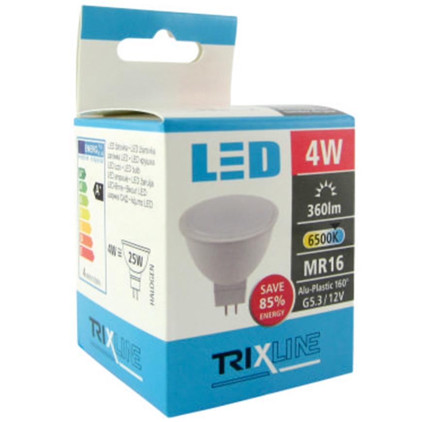 Żarówka LED TR MR16 4 W G5.3 to energooszczędne źródło światła o zimnej białej barwie (6500 K) i strumieniu świetlnym 360 lm. Posiada kąt świecenia 120°, co zapewnia szerokie i równomierne oświetlenie. Wyposażona w trzonek G5.3, działa przy napięciu 230 V i szybko osiąga pełną jasność (czas zapłonu 0,2 s). Charakteryzuje się żywotnością do 30 000 godzin, klasą efektywności energetycznej F oraz współczynnikiem oddawania barw ≥ 80. Idealna do opraw punktowych i oświetlenia akcentowego, nie zawiera rtęci.