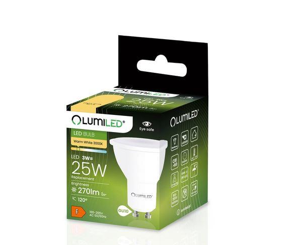 Energooszczędna żarówka LED Lumiled GU10 o mocy 3W, emitująca ciepłe, neutralne światło o temperaturze barwowej 4000K. Z jasnym strumieniem świetlnym 270 lumenów i szerokim kątem świecenia 120°, idealnie sprawdzi się do oświetlenia punktowego w domu i biurze. Produkt nie posiada funkcji przyciemniania, cechuje się długą żywotnością i niskim zużyciem energii, gwarantując efektywne i trwałe oświetlenie.