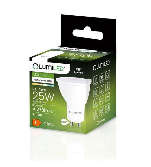 Energooszczędna żarówka LED Lumiled z gwintem GU10 o mocy 3W, oferująca strumień świetlny na poziomie 270 lumenów. Emituje przyjemne, neutralne światło o ciepłej temperaturze barwowej 2700K, które tworzy komfortową atmosferę w pomieszczeniach. Dzięki szerokiemu kątowi świecenia 120° doskonale nadaje się do oświetlenia akcentowego oraz ogólnego. Produkt nie posiada funkcji ściemniania, cechuje się wysoką trwałością i niskim zużyciem energii, będąc idealnym wyborem do domu i biura.