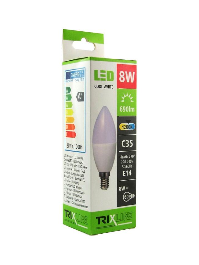 Żarówka TR LED C35 8W 4200K 690 lm E14 to energooszczędna żarówka LED o neutralnej barwie światła 4200K, zapewniającej jasne i naturalne oświetlenie pomieszczenia. Moc żarówki wynosi 8W, strumień świetlny 690 lm, a kąt świecenia 270° gwarantuje równomierne rozproszenie światła. Wyposażona w standardowy gwint E14, nie obsługuje przyciemniania ani zmiany kierunku świecenia. Klasa efektywności energetycznej: F, żywotność ok. 30 000 godzin, wskaźnik oddawania barw ≥80 zapewnia wierne odwzorowanie kolorów. Wymiary żarówki: 11,2 × 3,7 cm. Idealna do lamp stołowych, kinkietów i żyrandoli, gdzie potrzebne jest jasne, neutralne światło.
