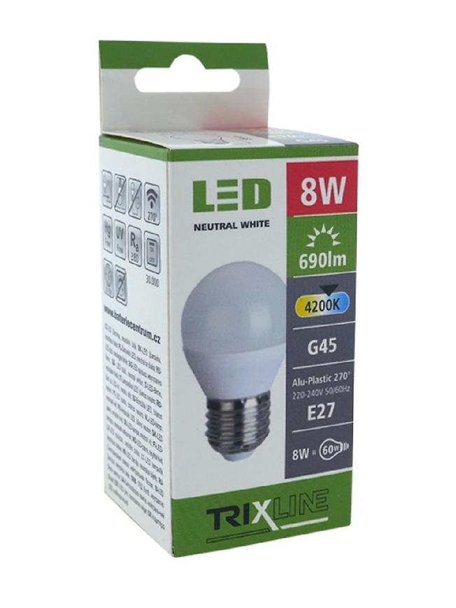 Żarówka TR LED G45 8W 4200K 688 lm E27 to energooszczędna żarówka LED o neutralnej barwie światła 4200K, zapewniająca jasne i naturalne oświetlenie. Moc żarówki wynosi 8W, strumień świetlny 690 lm, a kąt świecenia 270° gwarantuje równomierne rozproszenie światła. Posiada standardowy gwint E27, nie obsługuje przyciemniania ani zmiany kierunku świecenia. Klasa efektywności energetycznej: F, żywotność ok. 30 000 godzin, wskaźnik oddawania barw ≥80 zapewnia wierne odwzorowanie kolorów. Wymiary żarówki: 9,2 × 4,5 cm. Idealna do lamp w pomieszczeniach wymagających wyraźnego, neutralnego światła, np. w kuchniach, łazienkach i biurach.