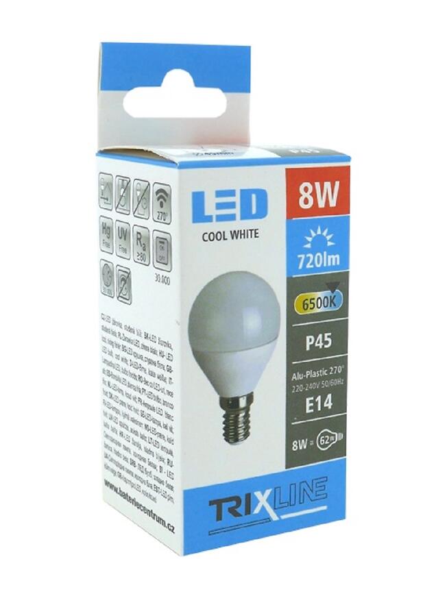 Żarówka TR LED P45 8W 6500K 720 lm E14 to wydajne źródło światła LED o zimnej barwie 6500K, zapewniającej jasne, wyraziste oświetlenie sprzyjające koncentracji. Moc żarówki wynosi 8W, strumień świetlny 720 lm, a kąt świecenia 270° gwarantuje równomierne rozproszenie światła. Wyposażona w standardowy gwint E14, nie obsługuje przyciemniania ani zmiany kierunku świecenia. Klasa efektywności energetycznej: F, żywotność ok. 30 000 godzin, wskaźnik oddawania barw ≥80 zapewnia wierne odwzorowanie kolorów. Wymiary żarówki: 9,2 × 4,5 cm. Doskonała do pomieszczeń wymagających intensywnego, chłodnego światła, takich jak biura, warsztaty czy kuchnie.