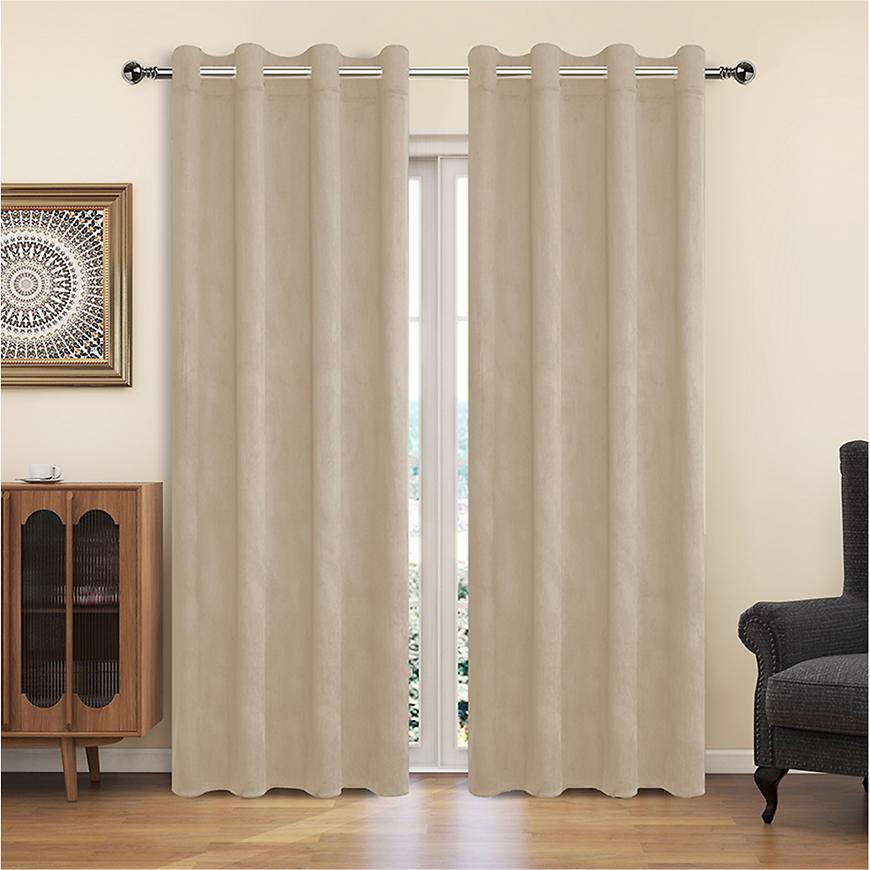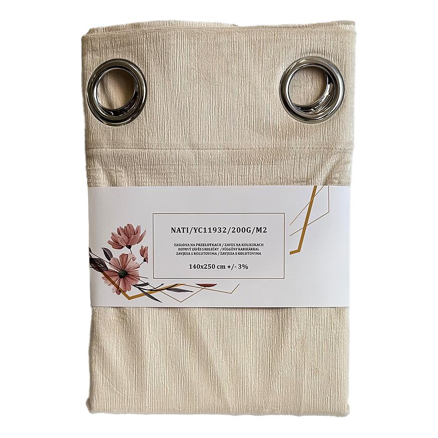 Zasłona na przelotkach w kolorze beżowym o wymiarach 140x250 cm łączy praktyczność z estetyką, tworząc przytulną i elegancką aranżację w salonie lub sypialni. Wykonana w 100% z trwałego poliestru, zapewnia odporność na codzienne użytkowanie, a jednocześnie łatwość utrzymania w czystości – zaleca się pranie w temperaturze 30˚C oraz prasowanie w razie potrzeby.