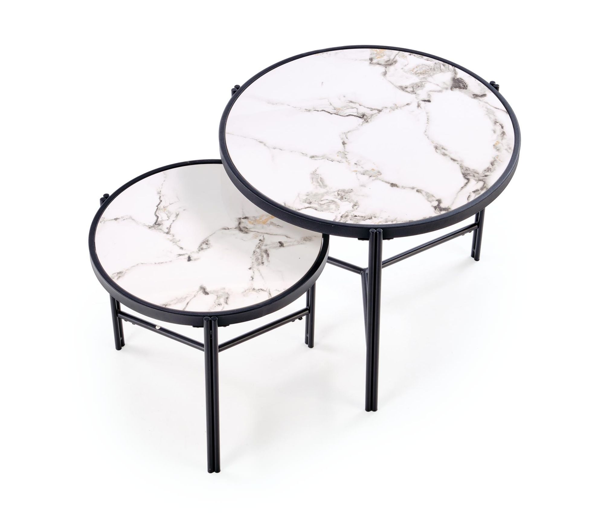 Mniejsza ława o wymiarach 48x43 cm doskonale sprawdzi się jako stolik boczny przy kanapie lub fotelu, natomiast większa 63x50 cm stanowi centralny punkt salonu. Zestaw 2 ław Amba umożliwia elastyczne aranżacje wnętrza – mogą być używane razem lub osobno, jako stylowe elementy dekoracyjne w salonie, biurze czy poczekalni.