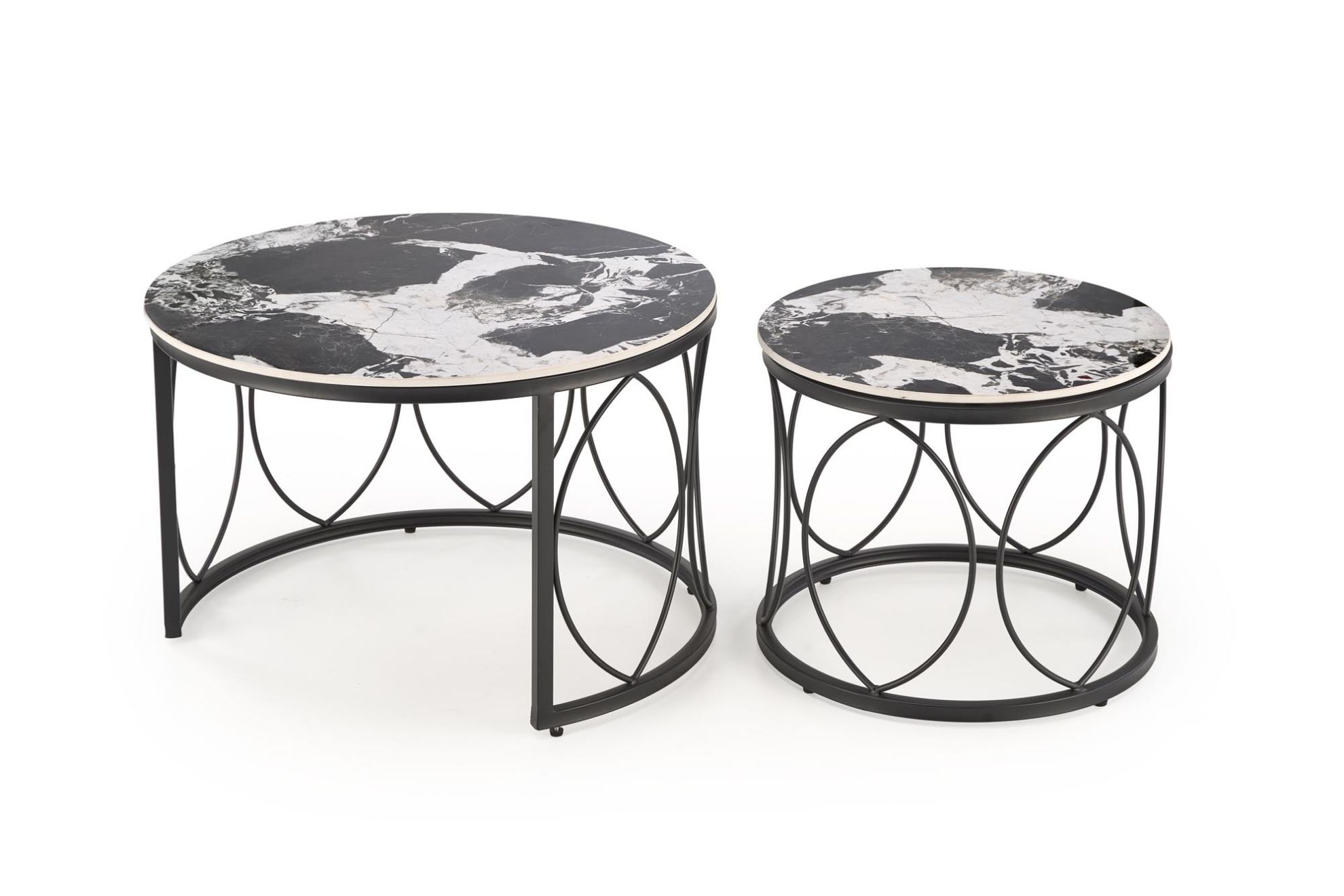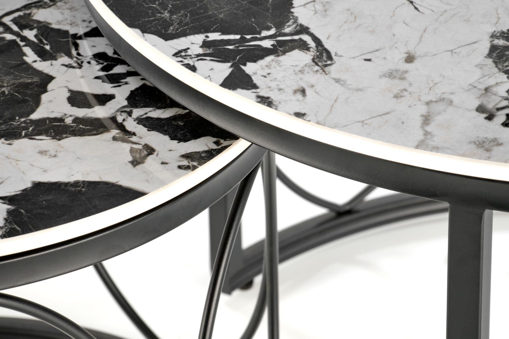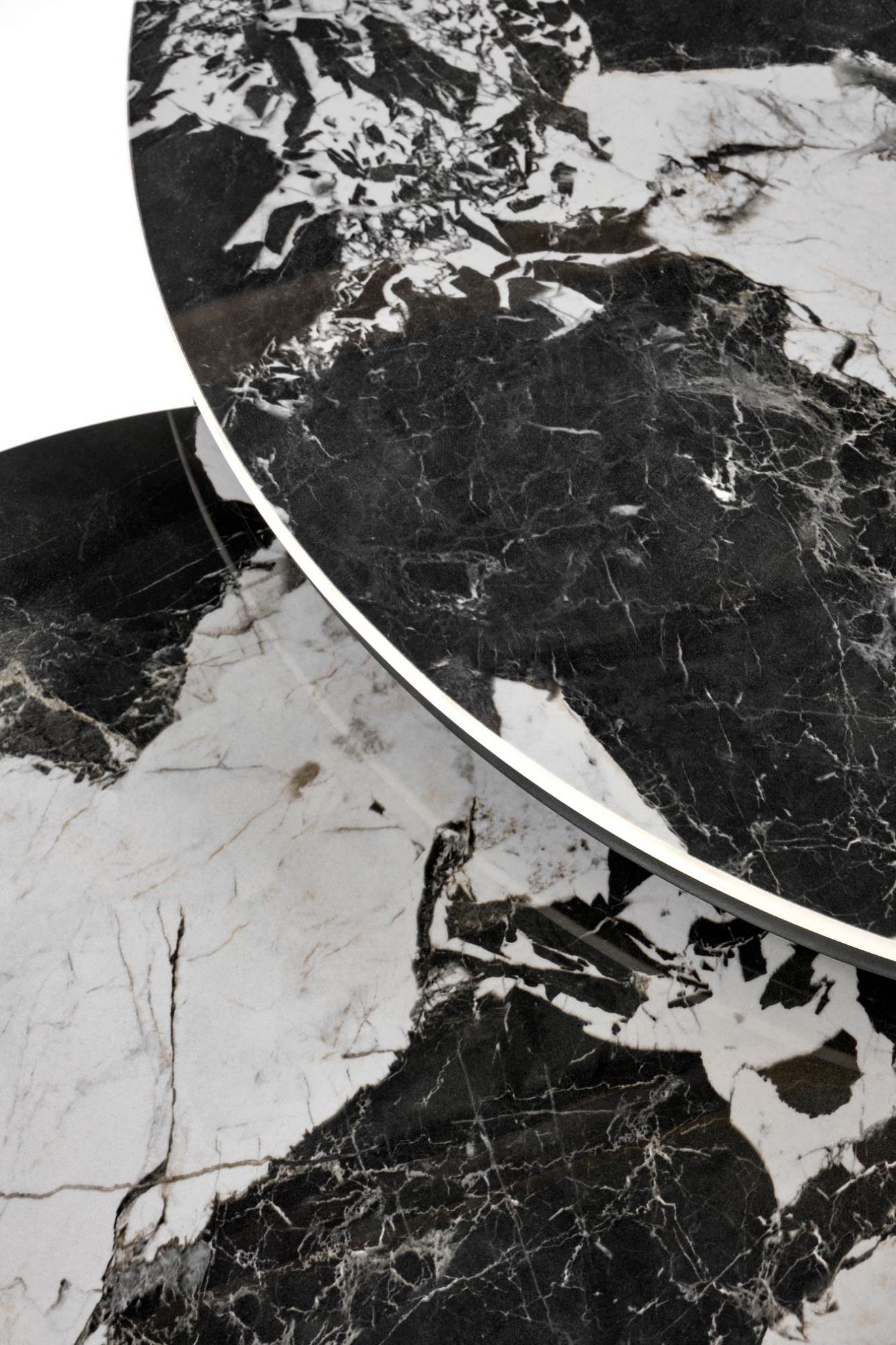 Stabilna konstrukcja z czarnej, proszkowo malowanej stali nie tylko doskonale komponuje się z marmurowym wykończeniem blatu, ale również gwarantuje solidność i długotrwałe użytkowanie. Zestaw składa się z dwóch ław o różnych wymiarach: większa o wymiarach 70 cm szerokości i 46 cm wysokości, a mniejsza o wymiarach 50 cm szerokości i 41 cm wysokości, co pozwala na łatwe dopasowanie do różnorodnych przestrzeni w domu.