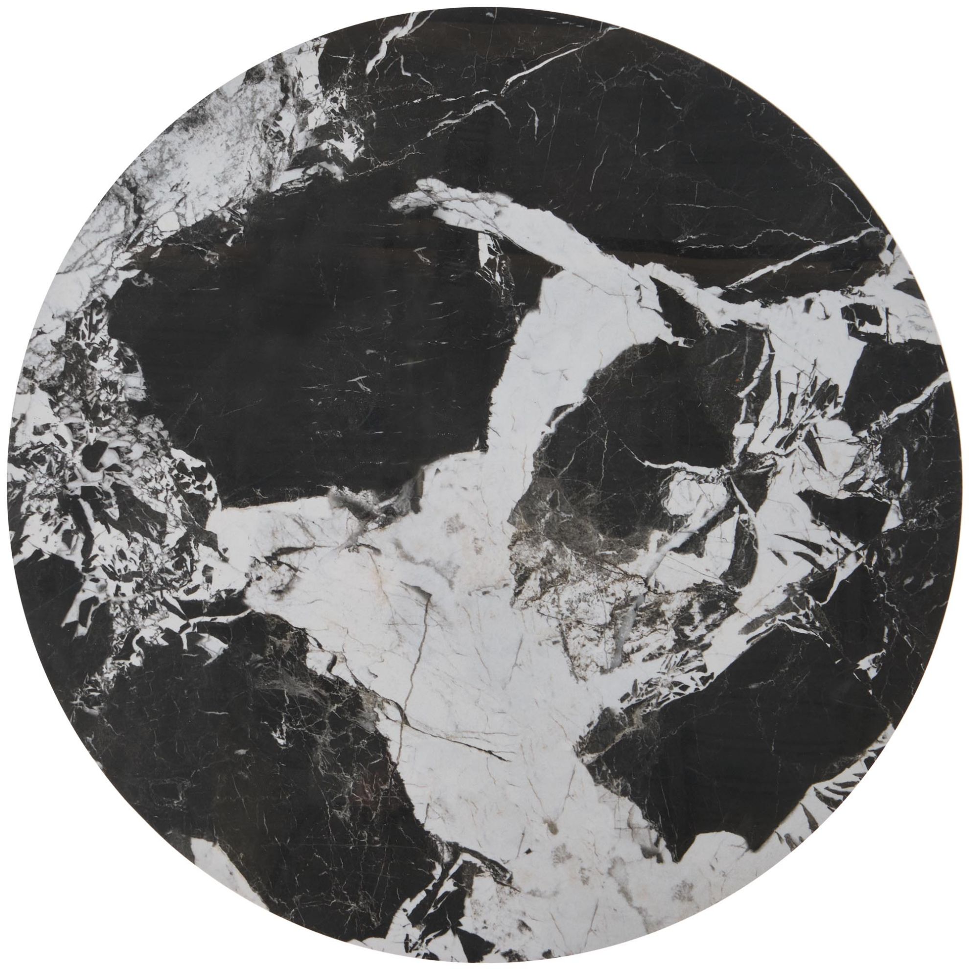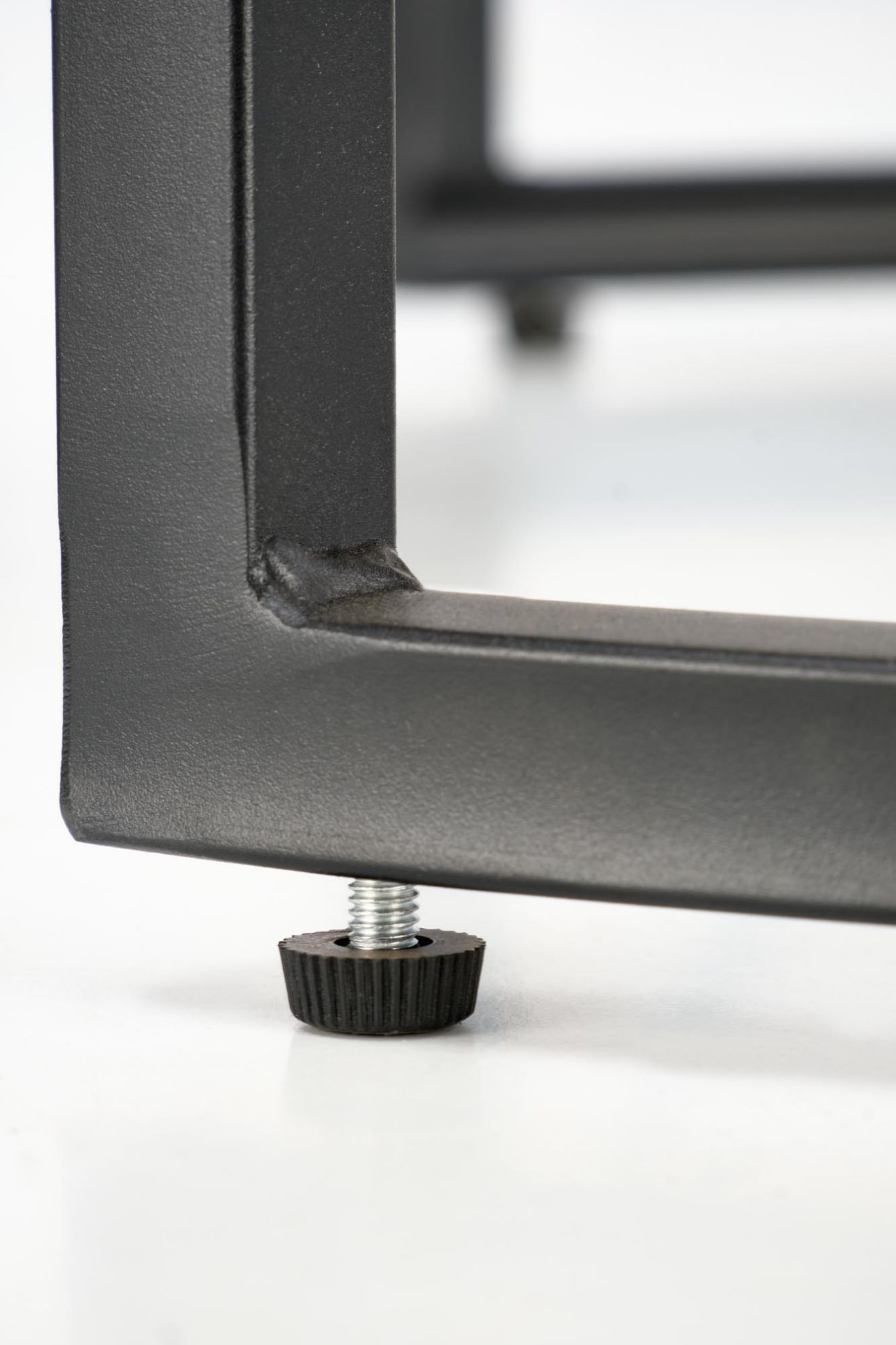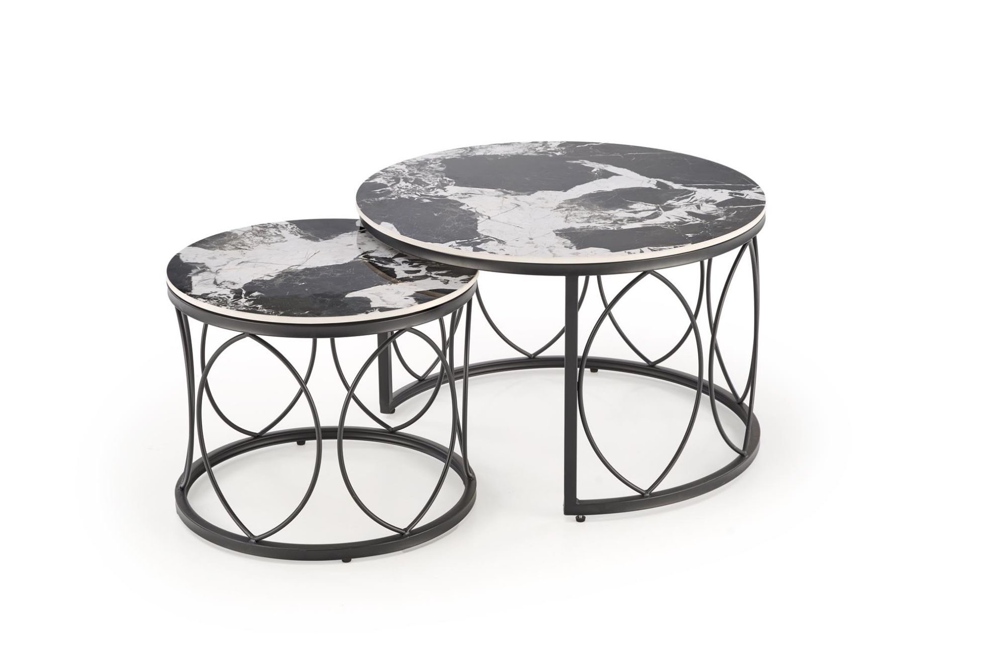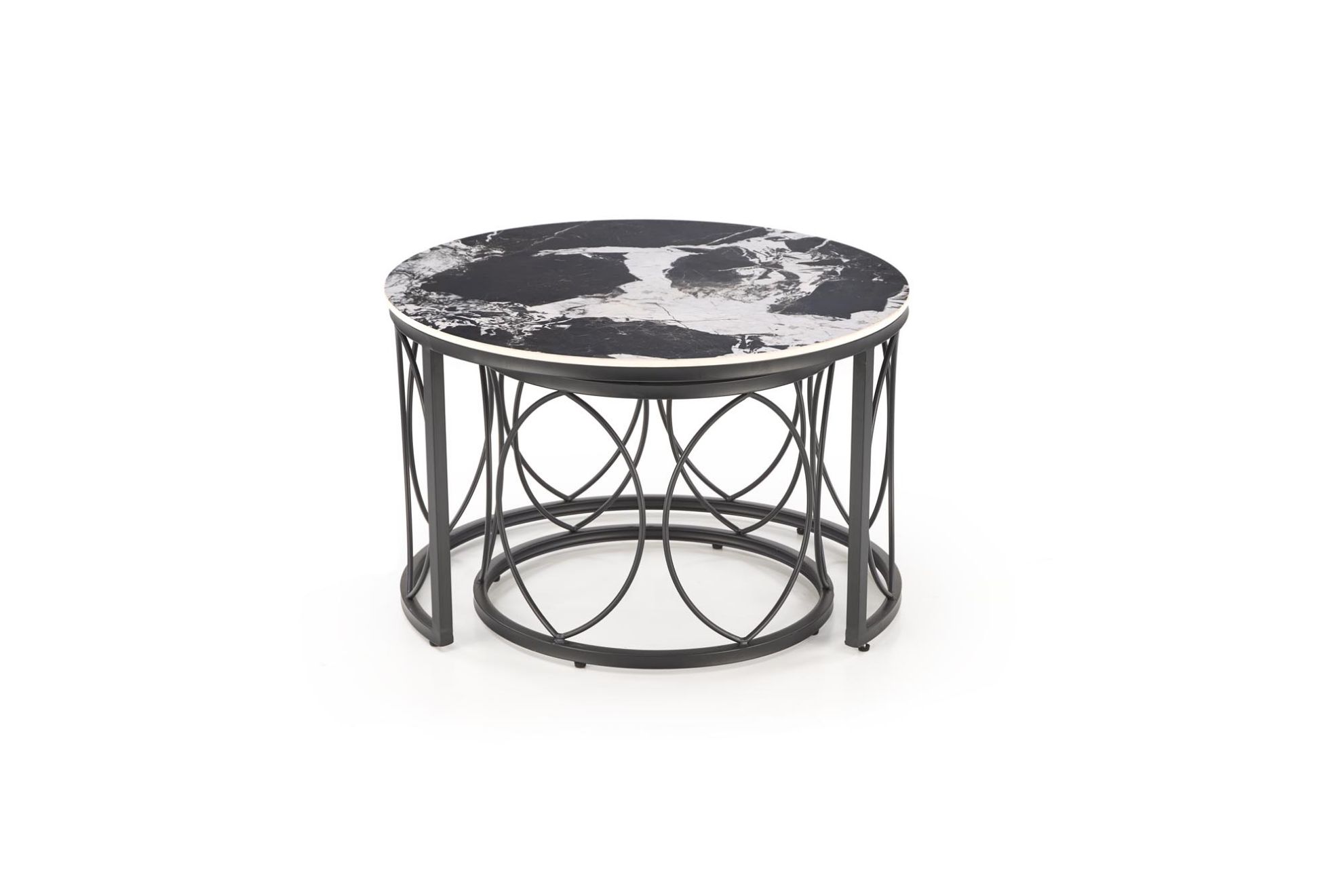 Stabilna konstrukcja z czarnej, proszkowo malowanej stali nie tylko doskonale komponuje się z marmurowym wykończeniem blatu, ale również gwarantuje solidność i długotrwałe użytkowanie. Zestaw składa się z dwóch ław o różnych wymiarach: większa o wymiarach 70 cm szerokości i 46 cm wysokości, a mniejsza o wymiarach 50 cm szerokości i 41 cm wysokości, co pozwala na łatwe dopasowanie do różnorodnych przestrzeni w domu.