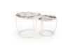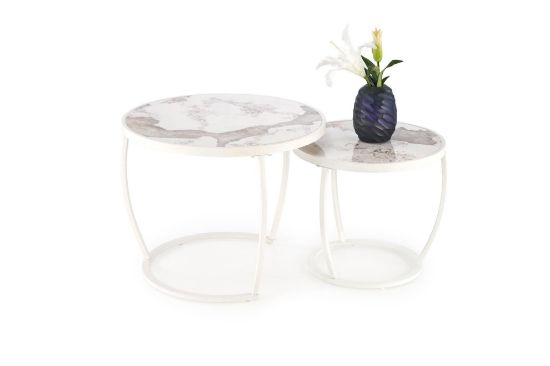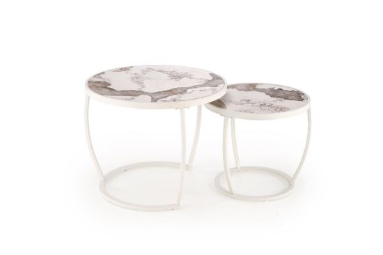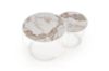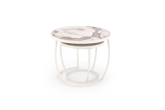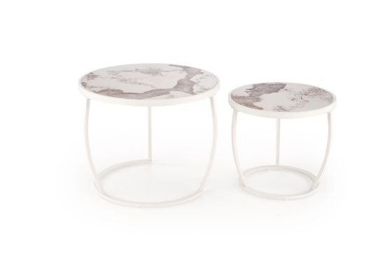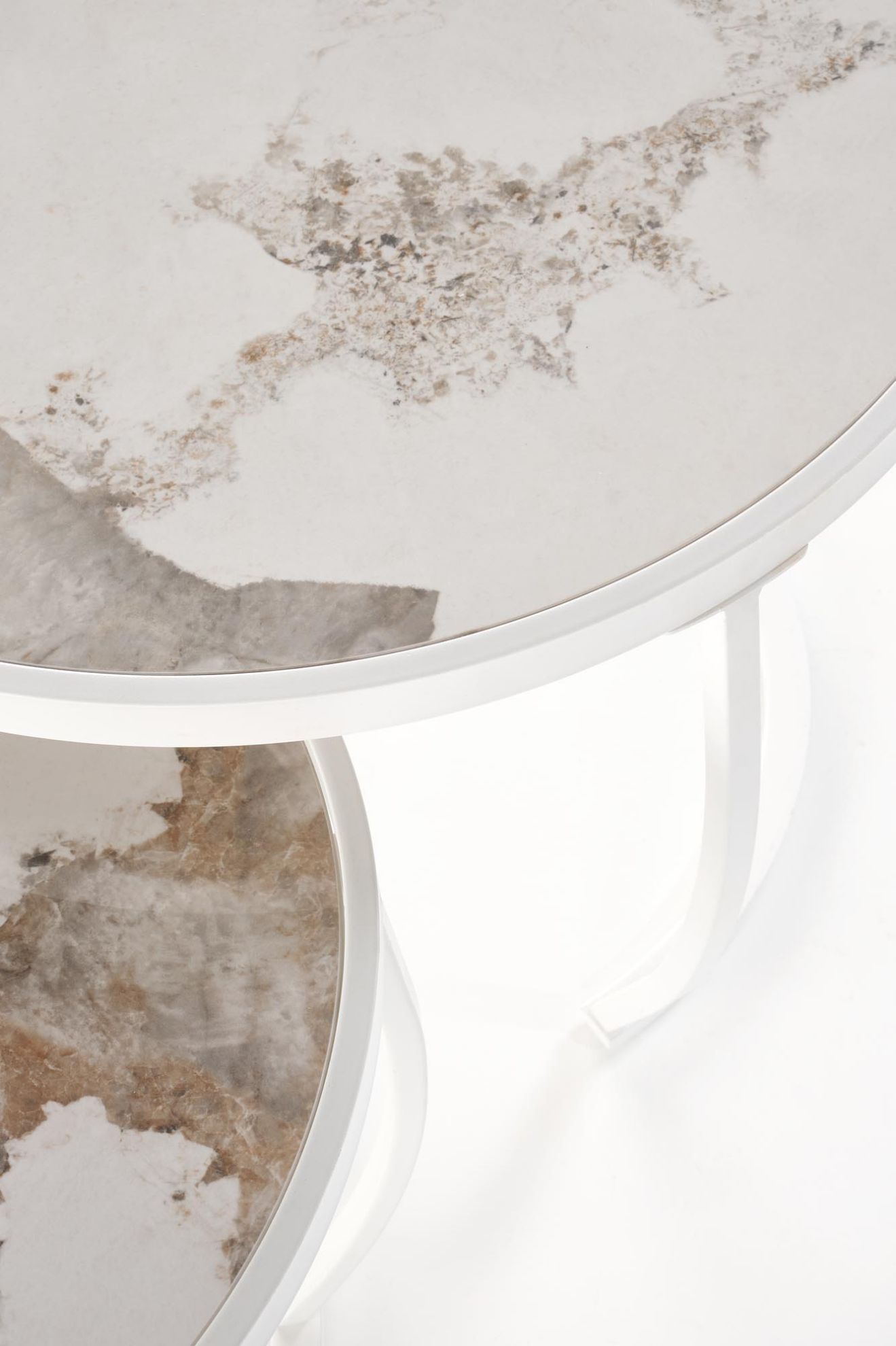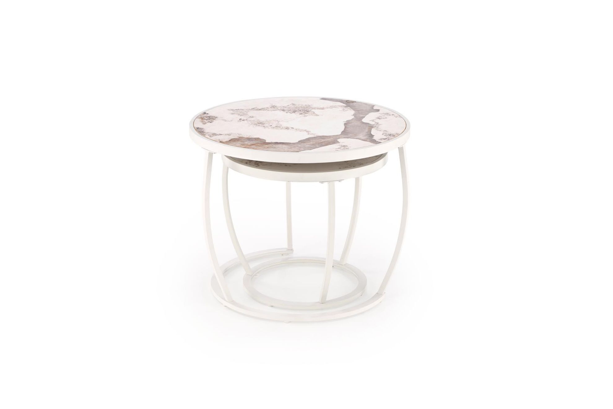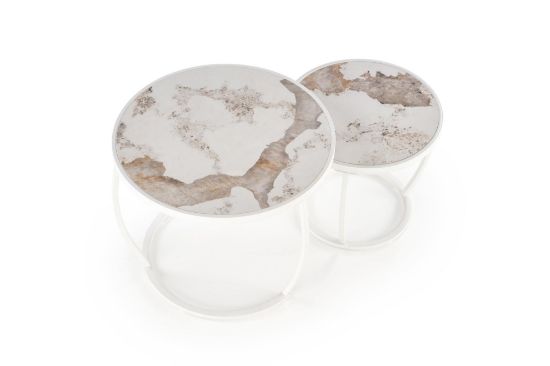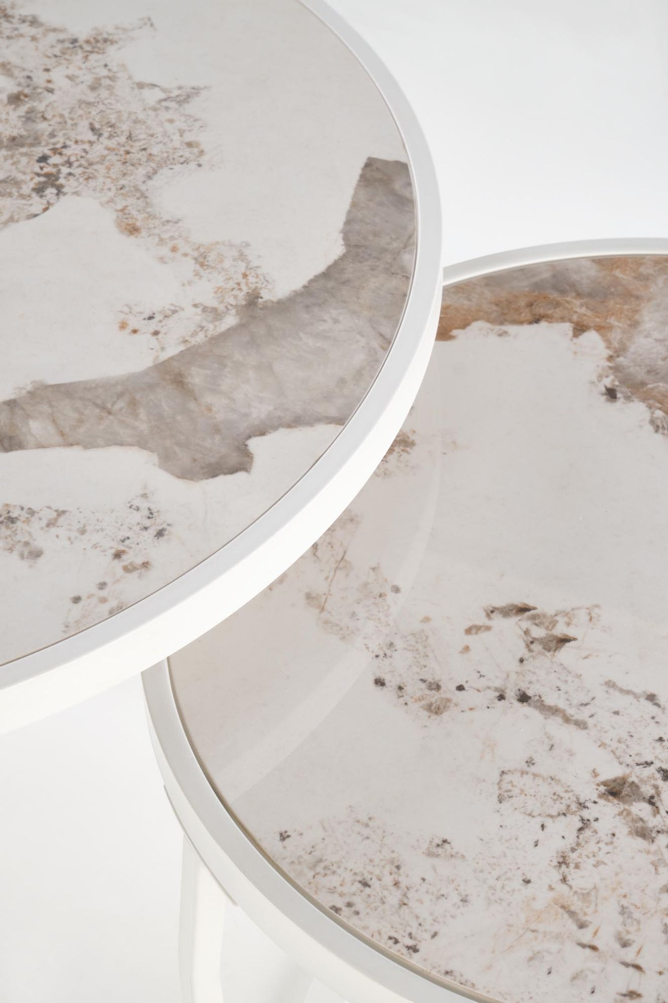 Zestaw składa się z dwóch ław o różnych rozmiarach, co dodaje im niepowtarzalnego uroku i pozwala dostosować je do różnych potrzeb oraz aranżacji przestrzeni. Pierwsza ława o wymiarach 62/50 cm , druga ława o wymiarach 47/43 zachwyca beżowym marmurem, który nadaje jej luksusowego wyglądu i podkreśla jej wyjątkowy charakter.
