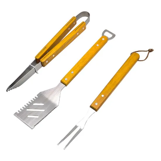 Praktyczny zestaw do grillowania zawiera szczypce, widelec i łopatkę, które ułatwiają przygotowanie mięsa, warzyw i innych potraw na grillu. Zapewnia wygodę oraz bezpieczeństwo podczas użytkowania.