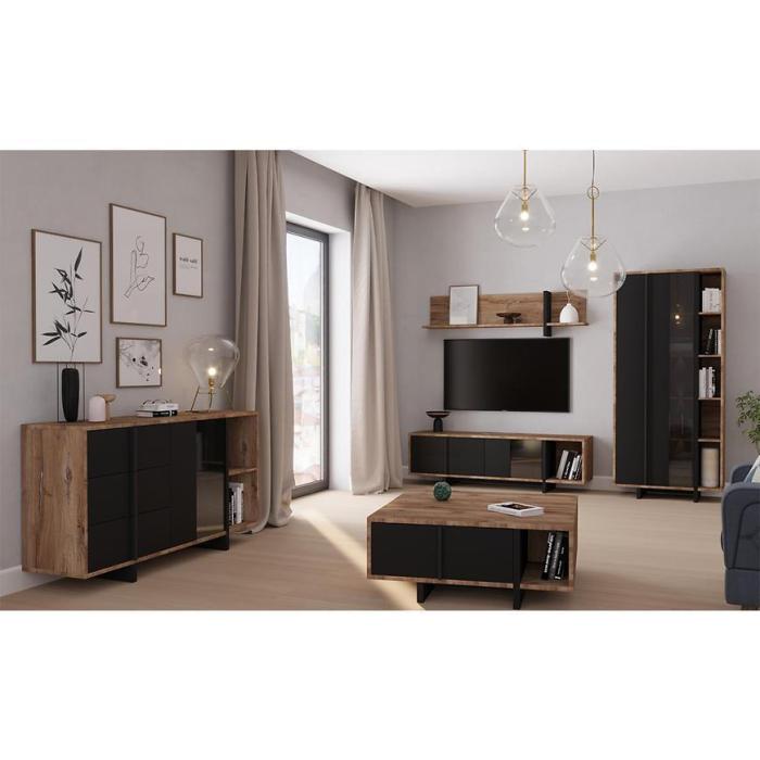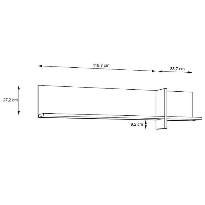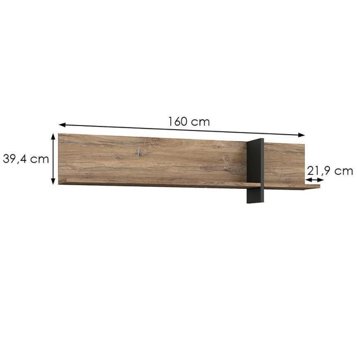 Półki Gudrid to przede wszystkim nowoczesność i funkcjonalność w jednym. Doskonale sprawdzi się w każdym salonie. Wygląd mebli jest nowoczesny, a zarazem uniwersalny. Półka wisząca została wykonana z płyty wiórowej laminowanej w kolorze dąb flagstaff/czarny.