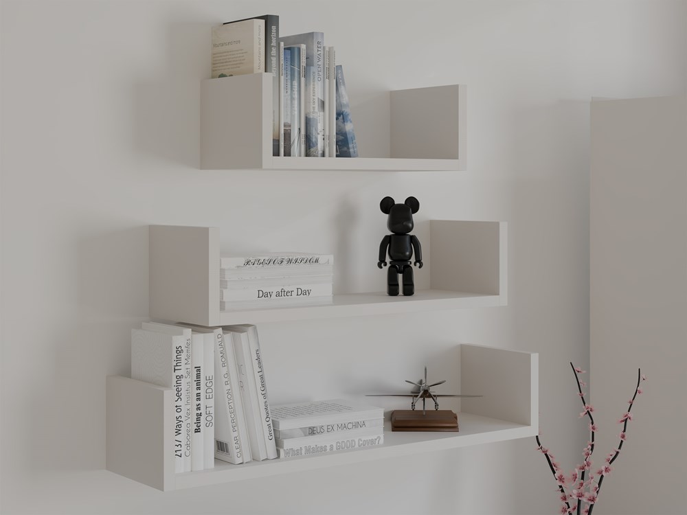 Trzy różne rozmiary dają wiele możliwości aranżacyjnych — półki można zamontować w jednej linii, ułożyć je w formie schodkowej lub rozmieścić w różnych częściach pomieszczenia, dopasowując układ do własnych potrzeb.