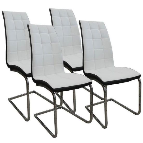 Zestaw 4 krzeseł Modern to nowoczesne krzesła, które idealnie wpasują się w jadalnie bądź inne, dowolne pomieszczenie. Krzesła wniosą do pomieszczenia elegancję oraz ciekawy wygląd. Dzięki swojemu wybarwieniu wpasują się w większość aranżacji. Krzesła zostały pokryte ekoskórą, która jest przyjemna w dotyku, natomiast wypełnienie to pianka, która zapewni komfort użytkowania. Wysokość do siedziska wynosi 50cm.
