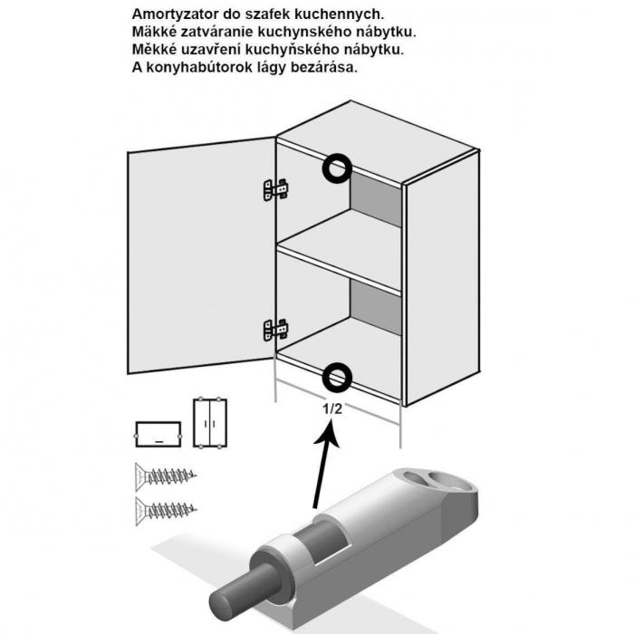 Opakowanie zawiera 5 sztuk amortyzatora z adapterem, umożliwiających wyciszenie pięciu drzwiczek meblowych.