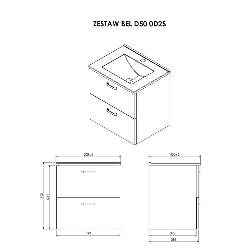 Zestaw BEL D50 biały to funkcjonalna i nowoczesna szafka łazienkowa podwieszana z umywalką w komplecie. Wykonana z płyty wiórowej z frontem w białym lakierze i korpusem w laminacie, łączy trwałość z eleganckim designem. Zestaw posiada 2 szuflady z systemem samodomykania oraz uchwyty w komplecie, idealny do samodzielnego montażu. Doskonale sprawdzi się w każdej łazience, zapewniając praktyczne przechowywanie i stylowe wykończenie wnętrza.