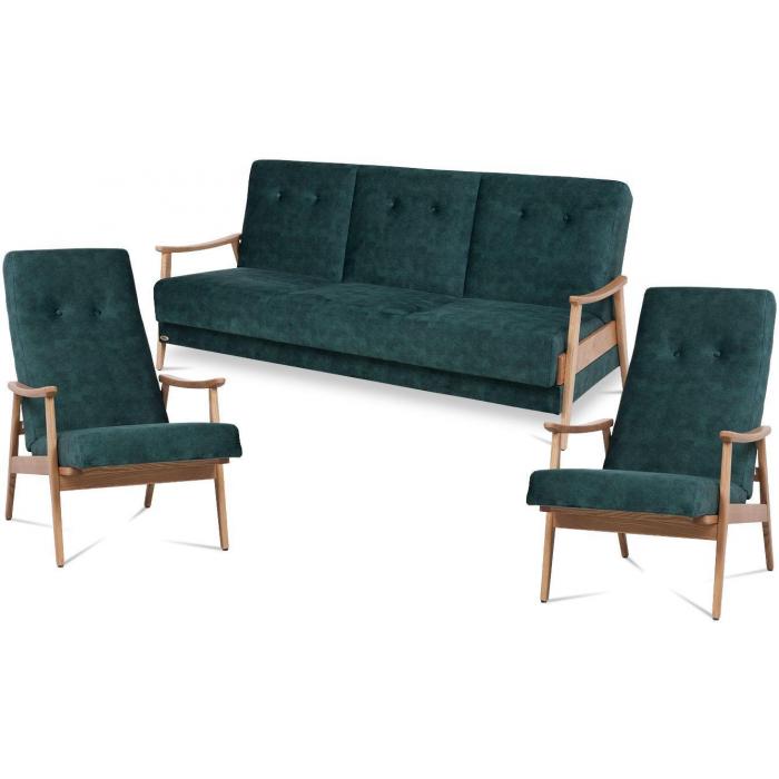 Zestaw Bondi to wersalka oraz dwa fotele. Dostępny w kolorze zielonym z ozdobnymi wciągami na oparciu. Poręcze wykonane są z jesionu w kolorze dąb naturalny mat, pokryte ekologicznym lakierem i bejcą wodną. Do produkcji stosowane są ekologiczne kleje wodne. Po rozłożeniu wersalki otrzymujemy powierzchnię do spania o wymiarach 120x188 cm, sposób rozkładania click-clack. Wersalka posiada pojemnik na pościel. Na siedzisku i w oparciu wersalki zastosowano sprężyny faliste, formatkę bonellową oraz wysokiej jakości piankę poliuretanową. Zestaw o bardzo wysokim komforcie użytkowania. Fotel posiada regulowane oparcie co pozwala na wypoczynek w pozycji półleżącej.