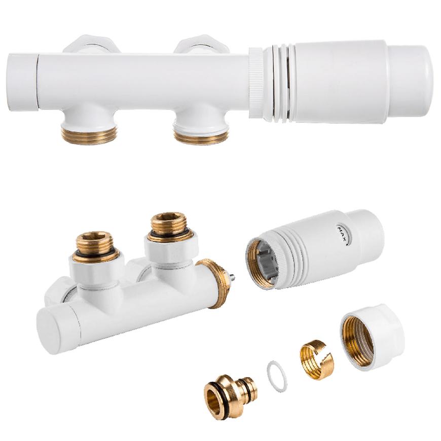 Przyłącza do Grzejnika (½) dla Instalacji z Miedzi 15 mm i PEX 16 mm: Zestaw ten obejmuje przyłącza, umożliwiające łatwe i efektywne podłączenie grzejnika do instalacji z rurami miedzianymi o średnicy 15 mm lub rurami PEX o średnicy 16 mm. To praktyczne rozwiązanie, które zwiększa wszechstronność zestawu, umożliwiając dostosowanie go do różnych systemów grzewczych.