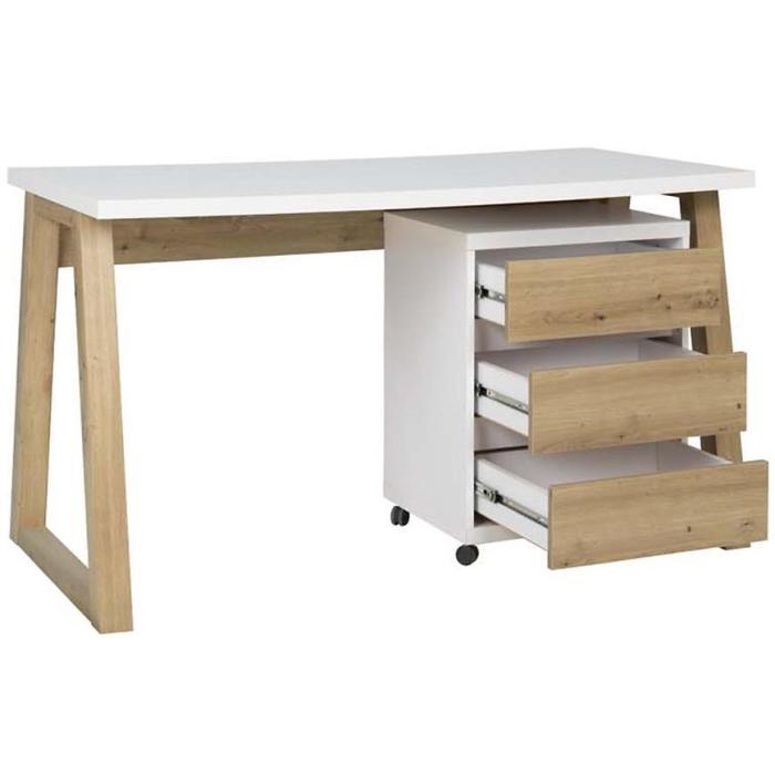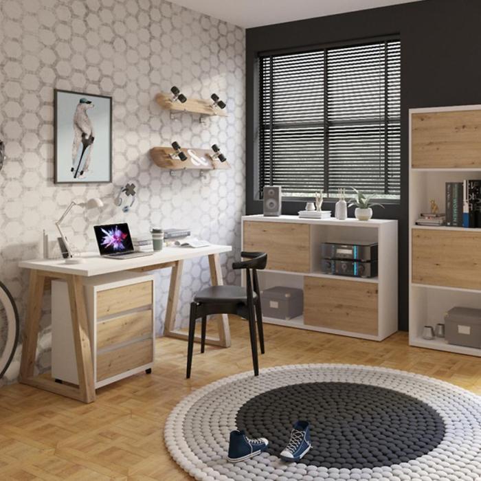 Biurko Iga to praktyczny mebel. Wykonane zostało z płyty wiórowej laminowanej. Dzięki starannemu wykończeniu posłuży przez wiele lat. Idealnie wpasuje się w nowoczesne wnętrza. Dzięki swojemu wybarwieniu będzie pasować do większości aranżacji np. w pokoju młodzieżowym.