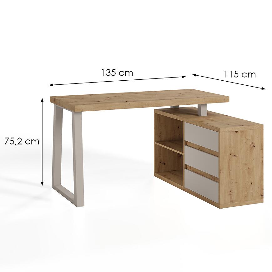Zestaw Iga II w kolorze Artisan/Kaszmir to nowoczesny zestaw biurkowy z matowym wykończeniem z laminowanej płyty wiórowej, składający się z biurka i komody z trzema szufladami. Mebel ma wysokość 75,2 cm, szerokość 135 cm i głębokość 115 cm, jest uniwersalny pod względem orientacji, waży 61 kg i wymaga samodzielnego montażu.