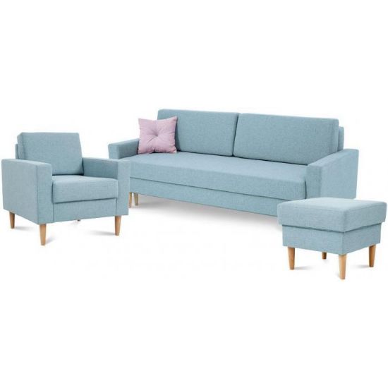 Jasny kolor, klasyczne kształty, uniwersalność - tym wszystkim charakteryzuje się, popularny już od wielu lat, styl prowansalski. Do wnętrza aranżowanego właśnie w takim wystroju idealnie nada się zestaw Kayla. Meble wchodzące w jego skład zaprojektowane zostały w prostych, kubistycznych kształtach. Siedzisko oraz oparcie kanapy wypełniono formatką bonellową, natomiast w siedziskach foteli zastosowano sprężynę falistą. Komfort podnoszą także dwie duże poduszki oparciowe, które znalazły się w komplecie. Trzecia, mniejsza, to ozdobny dodatek. Charakterystycznym elementem zestawu Kayla są również drewniane stożkowe nóżki w odcieniu bukowym. Całość dostępna jest w kilku jasnych wersjach kolorystycznych.