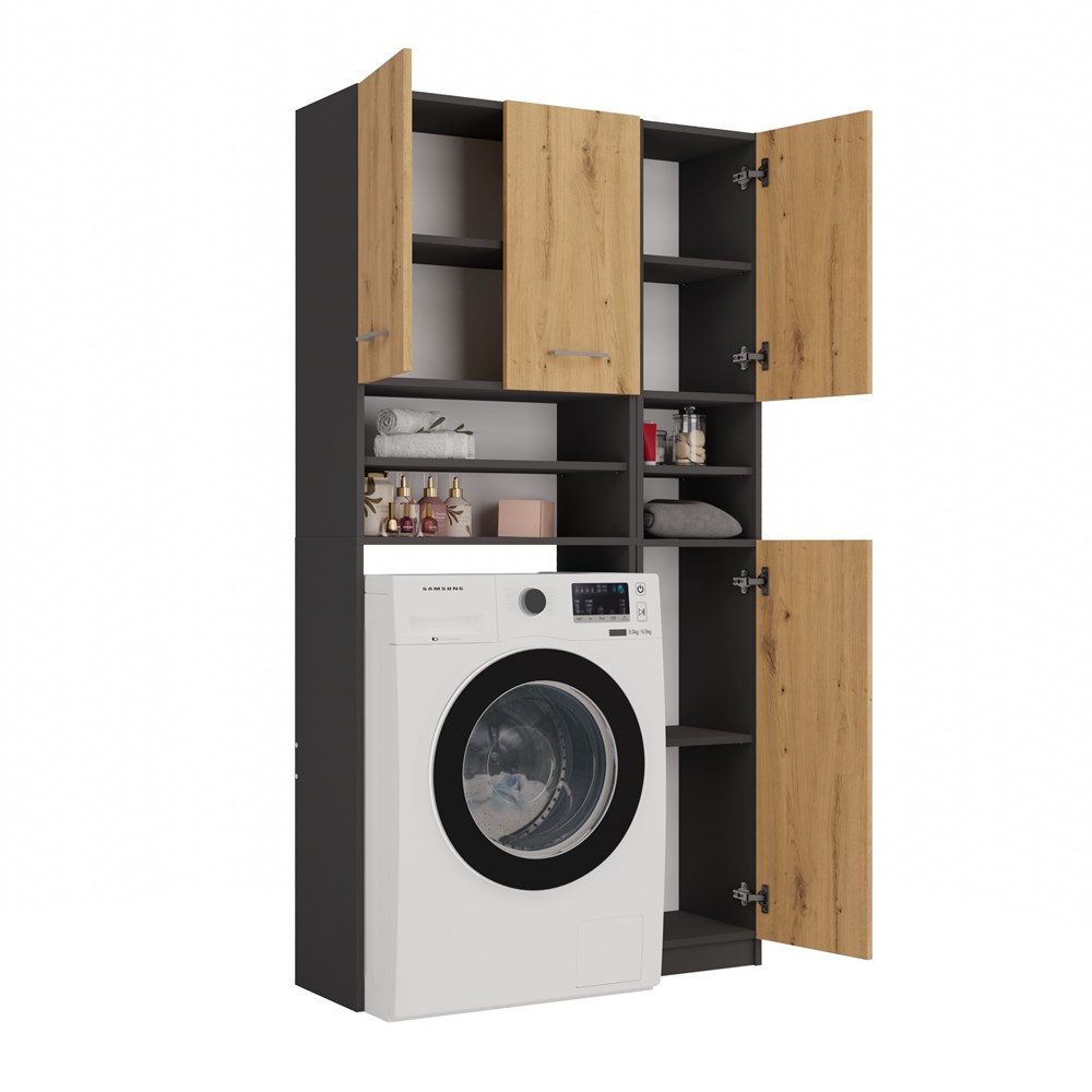Dodatkową zaletą zestawu Frankara jest możliwość wyboru strony otwierania drzwiczek - lewostronnie lub prawostronnie, co pozwala dostosować go do indywidualnych preferencji i potrzeb przestrzennych łazienki. Korpus i fronty mebla wykonane są z płyty wiórowej laminowanej, co zapewnia trwałość i łatwość w utrzymaniu czystości. Szerokość wnęki na pralkę wynosi 60,8 cm, a wysokość wnęki to 90,5 cm, co pozwala na idealne dopasowanie mebla do Twojej przestrzeni.Plastikowe uchwyty w kolorze srebrnym nadają zestawowi elegancki wygląd, podkreślając jednocześnie jego nowoczesny charakter.