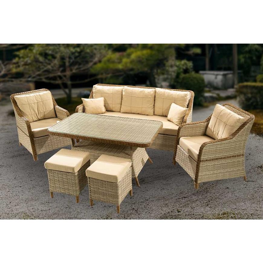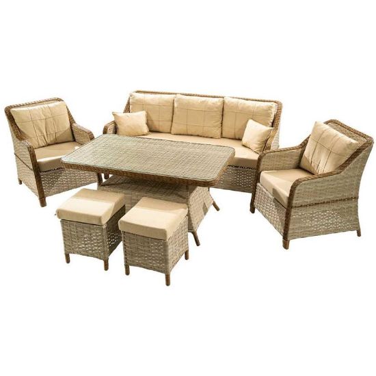 Masywna rama zapewnia stabilność i trwałość całego zestawu. Technorattan w odcieniach beżu i brązu nadaje meblom eleganckiego wyglądu, jednocześnie sprawiając, że są one odporne na warunki atmosferyczne i promieniowanie UV.