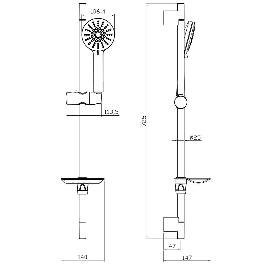 Stalowy drążek oraz wąż w metalowym oplocie gwarantują odporność na wilgoć i codzienne użytkowanie. Lekka rączka z tworzywa sztucznego jest ergonomiczna i łatwa w utrzymaniu czystości. System montażu naścienny zapewnia stabilność i prosty montaż.