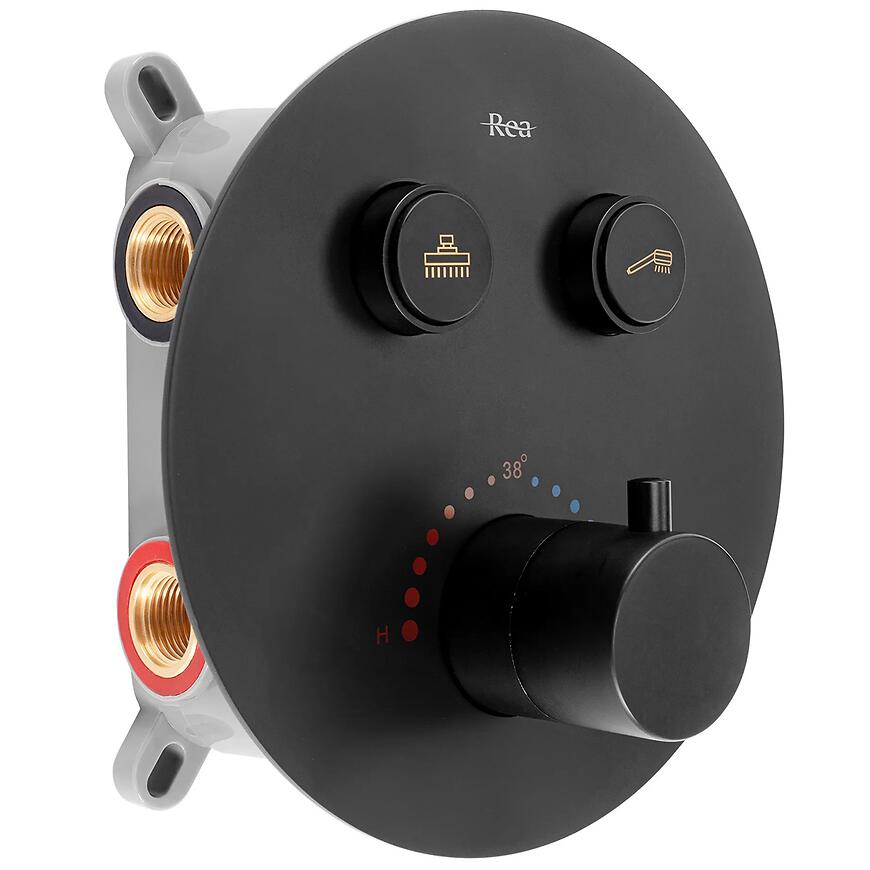 Rea Lungo czarny + BOX to propozycja dla osób oczekujących estetyki, jakości oraz wygody korzystania z natrysku opartego o stabilną pracę termostatu i solidną konstrukcję.