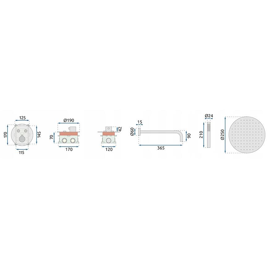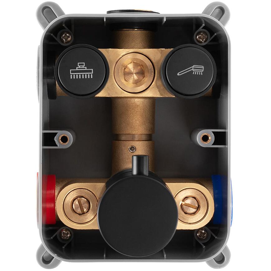 Materiałem bazowym jest mosiądz, co jest doceniane za odporność na eksploatację i długotrwałe użytkowanie. Bateria termostatyczna zapewnia stabilną temperaturę wody, bez gwałtownych wahań. Ceramiczna głowica wewnątrz armatury stanowi gwarancję trwałości i skutecznej pracy całego mechanizmu. Na wyposażeniu znajduje się duża deszczownica o średnicy 25 cm oraz dwufunkcyjna rączka natryskowa, pozwalająca zmieniać tryb natrysku w zależności od preferencji. BOX dostarczony w zestawie ułatwia profesjonalny i poprawny montaż podtynkowy.