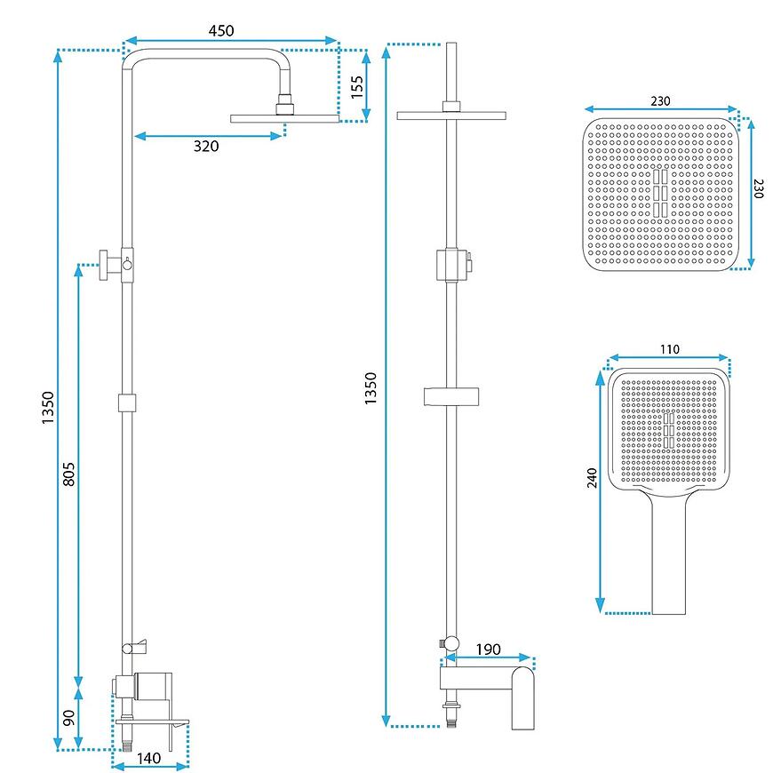 Zestaw posiada drążek o długości 135 cm, deszczownicę o wymiarze 23x23 cm oraz 3-funkcyjną rączkę natryskową, umożliwiającą wybór preferowanego rodzaju strumienia. Ceramiczna głowica zapewnia płynne działanie przy regulacji przepływu wody, a bateria mechaniczna pozwala na precyzyjne sterowanie temperaturą. Wąż natryskowy o długości 150 cm umożliwia swobodę ruchu podczas korzystania z natrysku.