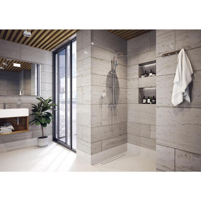 Zestaw prysznicowy z baterią termostatyczną, wykonany z metalu w kolorze chromu. Rączka natryskowa wykonana z tworzywa sztucznego posiada 3 strumienie.