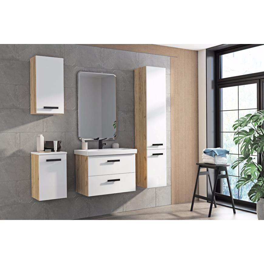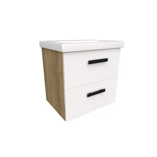 Zestaw Songa 50 cm 2S dąb/biały to nowoczesny i funkcjonalny mebel łazienkowy z umywalką w zestawie. Wykonany z płyty wiórowej, z frontem lakierowanym na biało i korpusem w dekorze dąb craft złoty, łączy elegancję z trwałością. Model 2-szufladowy, podwieszany, wyposażony w system samodomykania i uchwyty w zestawie, przeznaczony do samodzielnego montażu. Idealny do małych i średnich łazienek, zapewnia praktyczne miejsce do przechowywania akcesoriów.
