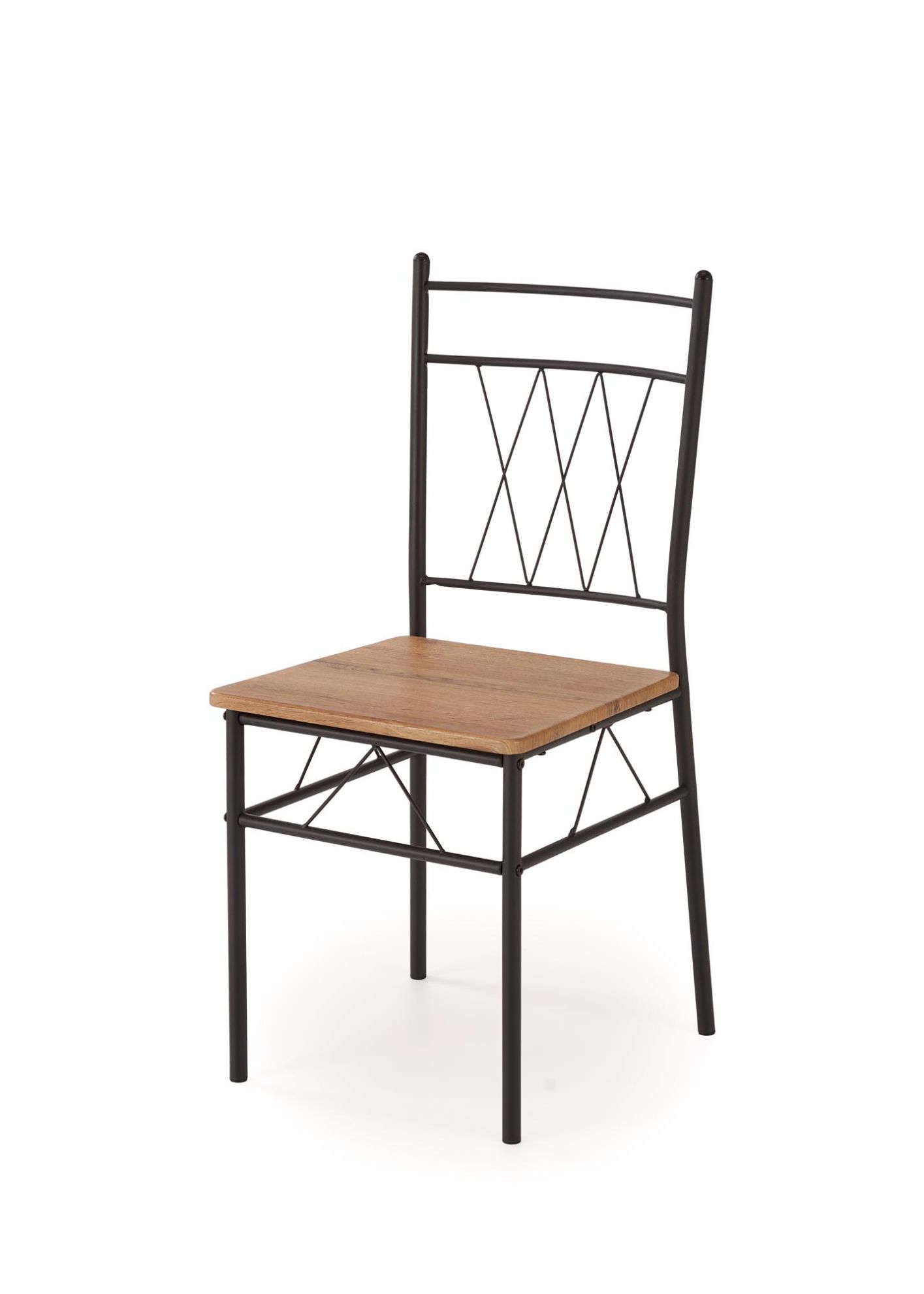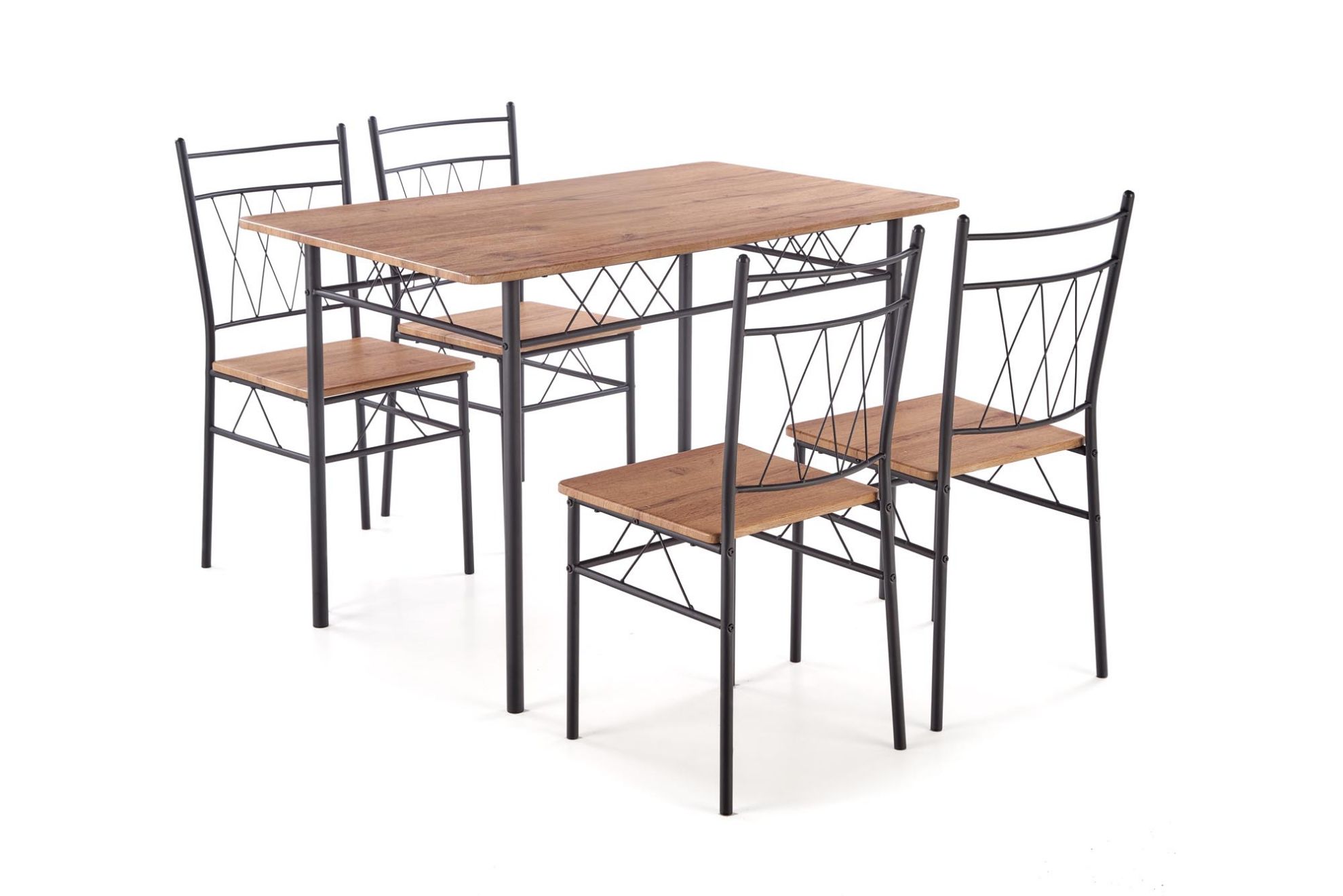 Zestaw Fati 3 łączy klasyczny design z praktycznością. Stół prostokątny o wymiarach 110/70/75 cm wykonany z MDF okleinowanego w naturalnym kolorze, na stabilnym czarnym metalowym stelażu. Zestaw zawiera cztery wygodne krzesła w czarnej kolorystyce, które harmonijnie współgrają ze stołem.