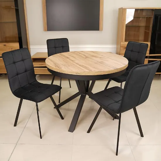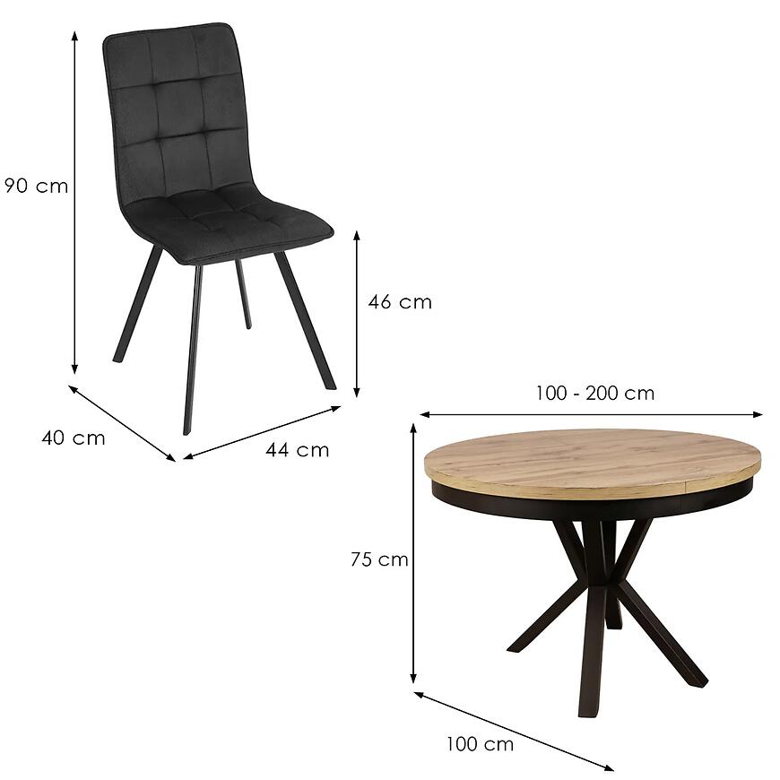 Centralnym elementem zestawu jest rozkładany stół o średnicy 100 cm, który po rozłożeniu osiąga długość aż 200 cm, zapewniając komfortową przestrzeń dla większej liczby gości. Wysokość stołu wynosi 76 cm, a blat wykonany z płyty laminowanej o matowym wykończeniu gwarantuje łatwe utrzymanie w czystości oraz odporność na codzienne użytkowanie. Okrągły kształt blatu sprzyja swobodnej komunikacji i tworzy przyjazną atmosferę podczas posiłków.