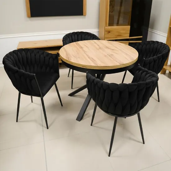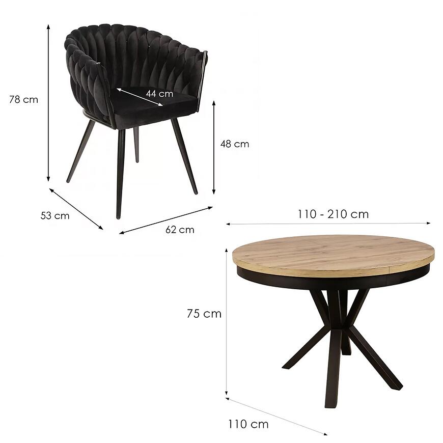 Centralnym elementem zestawu jest stół rozkładany o średnicy 100 cm, który po rozłożeniu osiąga długość aż 200 cm. Dzięki temu z łatwością dostosujesz przestrzeń do liczby gości. Wysokość stołu wynosi 76 cm, a blat wykonany z płyty laminowanej posiada matowe wykończenie, co zwiększa odporność na codzienne użytkowanie i ułatwia utrzymanie czystości. Okrągły kształt blatu sprzyja komfortowej aranżacji przestrzeni i swobodnej komunikacji przy stole.