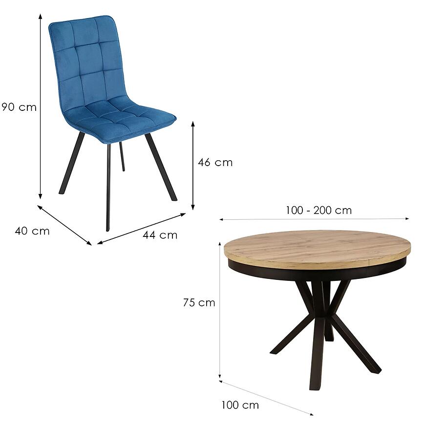 Zestaw stół i krzesła 1+4 Saba to propozycja dla osób poszukujących funkcjonalnego i estetycznego rozwiązania do przestrzeni jadalnianej. Nowoczesny styl w połączeniu z wybarwieniem wotan/czarny sprawia, że komplet doskonale wpisuje się zarówno w jasne, jak i bardziej wyraziste aranżacje wnętrz. Okrągły blat o szerokości 100 cm wykonany z płyty laminowanej w matowym wykończeniu gwarantuje trwałość oraz łatwość utrzymania w czystości. Dzięki funkcji rozkładania stół zwiększa swoją długość z 100 cm do aż 200 cm, co pozwala wygodnie ugościć większą liczbę osób podczas rodzinnych spotkań czy przyjęć.