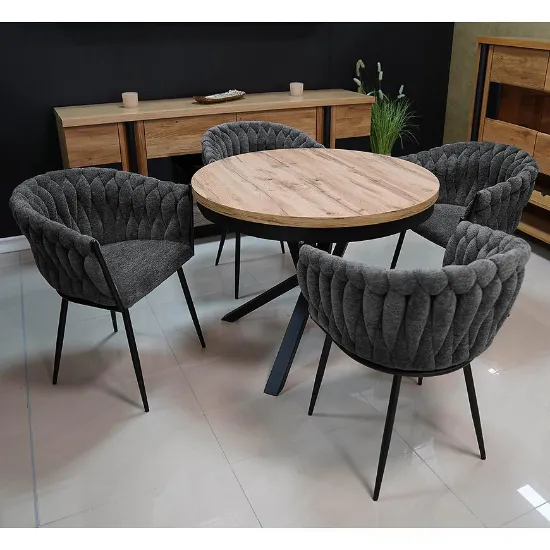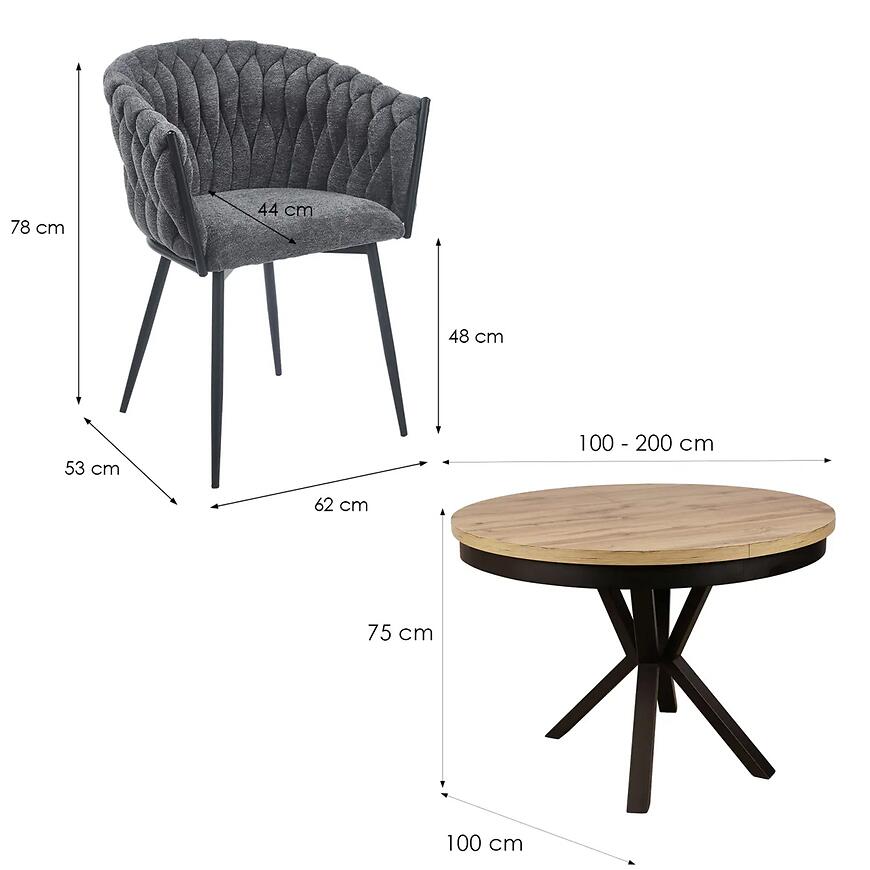 Centralnym elementem zestawu jest okrągły stół rozkładany, który na co dzień zajmuje niewiele miejsca (100 cm średnicy), a po rozłożeniu osiąga aż 200 cm długości. Dzięki temu bez problemu pomieści większą liczbę gości podczas rodzinnych spotkań czy przyjęć.