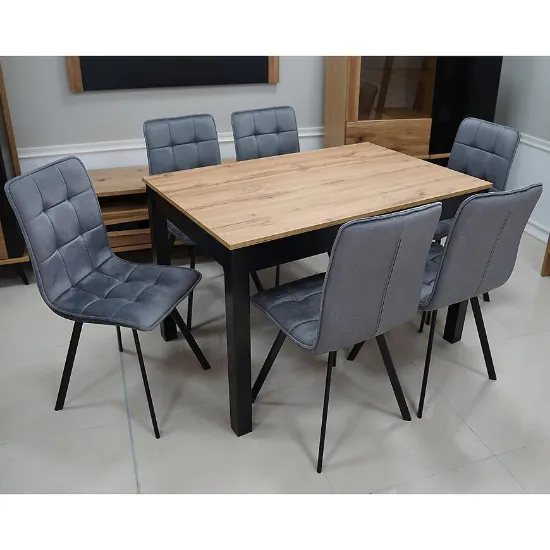 Szukasz funkcjonalnego i stylowego rozwiązania do jadalni lub salonu? Zestaw stół i krzesła 1+6 Auri to doskonały wybór dla osób, które cenią nowoczesny design, wygodę oraz praktyczne rozwiązania. Połączenie jasnego wybarwienia drewnopodobnego w odcieniu wotan z czarnymi elementami sprawia, że komplet świetnie wpisuje się w aktualne trendy wnętrzarskie.