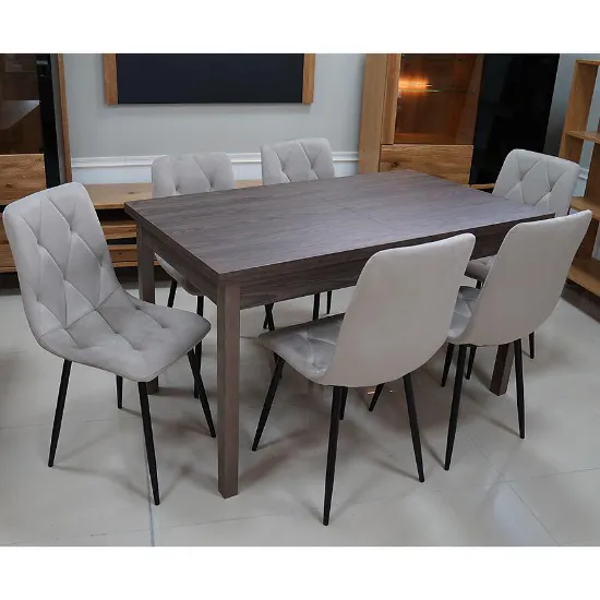 Zestaw wykonany został z płyty laminowanej, co zapewnia odporność na codzienne użytkowanie. Stabilna konstrukcja oraz staranne wykończenie sprawiają, że komplet sprawdzi się zarówno w jadalni, jak i salonie. Całość utrzymana jest w nowoczesnym stylu, który łatwo dopasować do różnych aranżacji wnętrz.