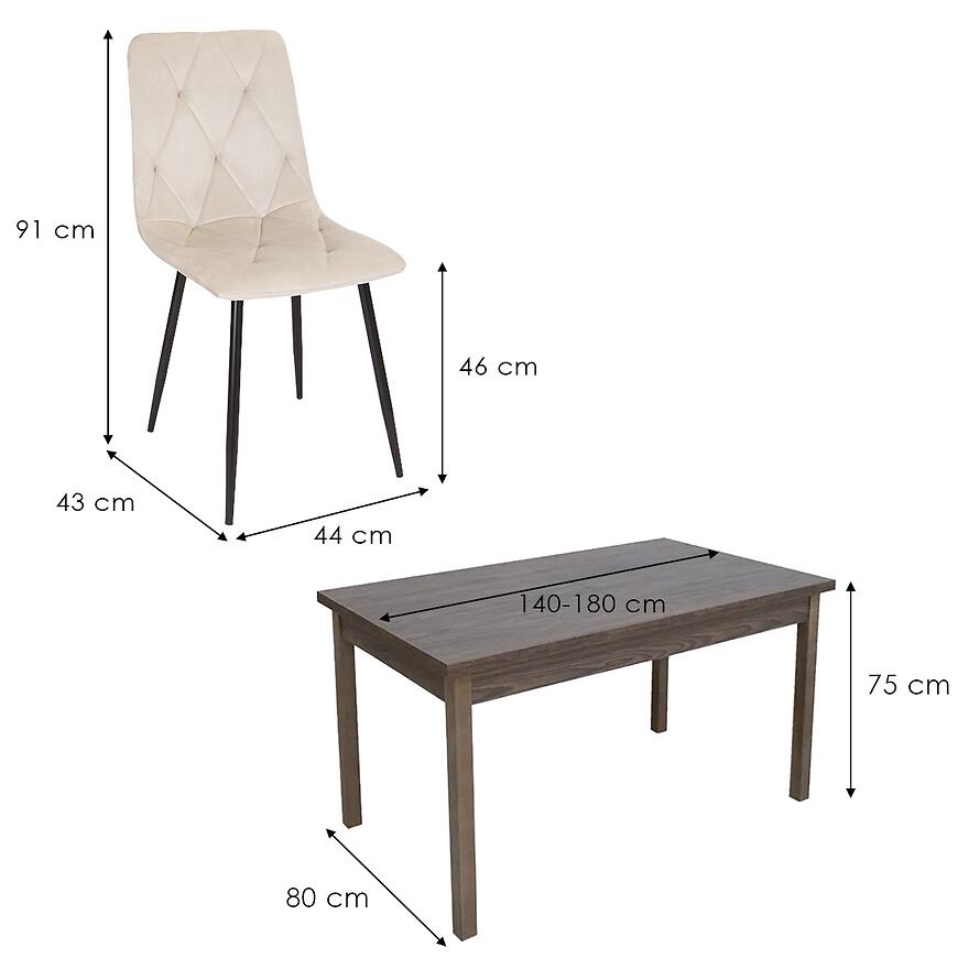 Stół o wymiarach 140 cm długości przed rozłożeniem i aż 180 cm po rozłożeniu zapewnia elastyczność użytkowania. To idealne rozwiązanie zarówno na codzienne posiłki, jak i większe spotkania rodzinne. Prostokątny blat o szerokości 80 cm i wysokości 75 cm oferuje komfortową przestrzeń dla wszystkich domowników. Matowe wykończenie blatu dodaje elegancji i ułatwia utrzymanie czystości.