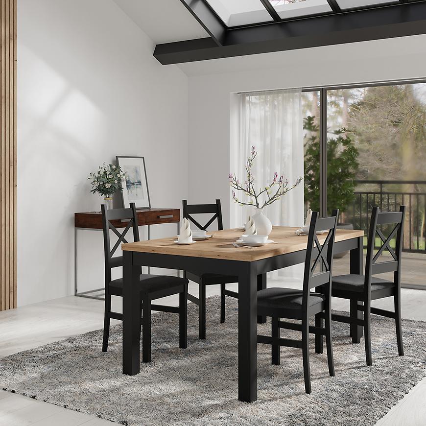 Centralnym punktem zestawu jest prostokątny stół, którego rozkładany blat pozwala na elastyczne dostosowanie przestrzeni do Twoich potrzeb. Przed rozłożeniem świetnie sprawdza się jako codzienny stół do posiłków, natomiast po rozłożeniu oferuje dodatkową przestrzeń, idealną na większe spotkania rodzinne lub towarzyskie. Blat stołu wykończony jest w matowym wybarwieniu, co nadaje mu elegancki, subtelny charakter, jednocześnie ułatwiając utrzymanie go w czystości. Materiał wykonania to połączenie płyty laminowanej i drewna, co zapewnia trwałość oraz odporność na codzienne użytkowanie.