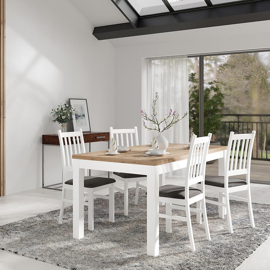Centralnym punktem zestawu jest prostokątny stół, którego rozkładany blat pozwala na elastyczne dostosowanie przestrzeni do Twoich potrzeb. Przed rozłożeniem świetnie sprawdza się jako codzienny stół do posiłków, natomiast po rozłożeniu oferuje dodatkową przestrzeń, idealną na większe spotkania rodzinne lub towarzyskie. Blat stołu wykończony jest w matowym wybarwieniu, co nadaje mu elegancki, subtelny charakter, jednocześnie ułatwiając utrzymanie go w czystości. Materiał wykonania to połączenie płyty laminowanej i drewna, co zapewnia trwałość oraz odporność na codzienne użytkowanie.