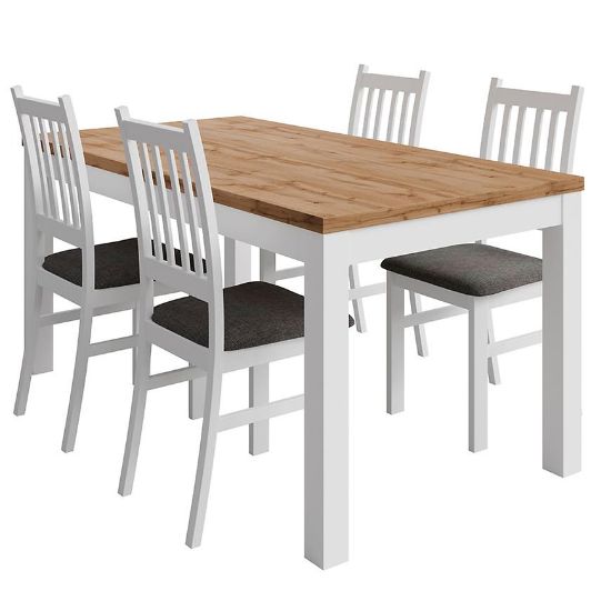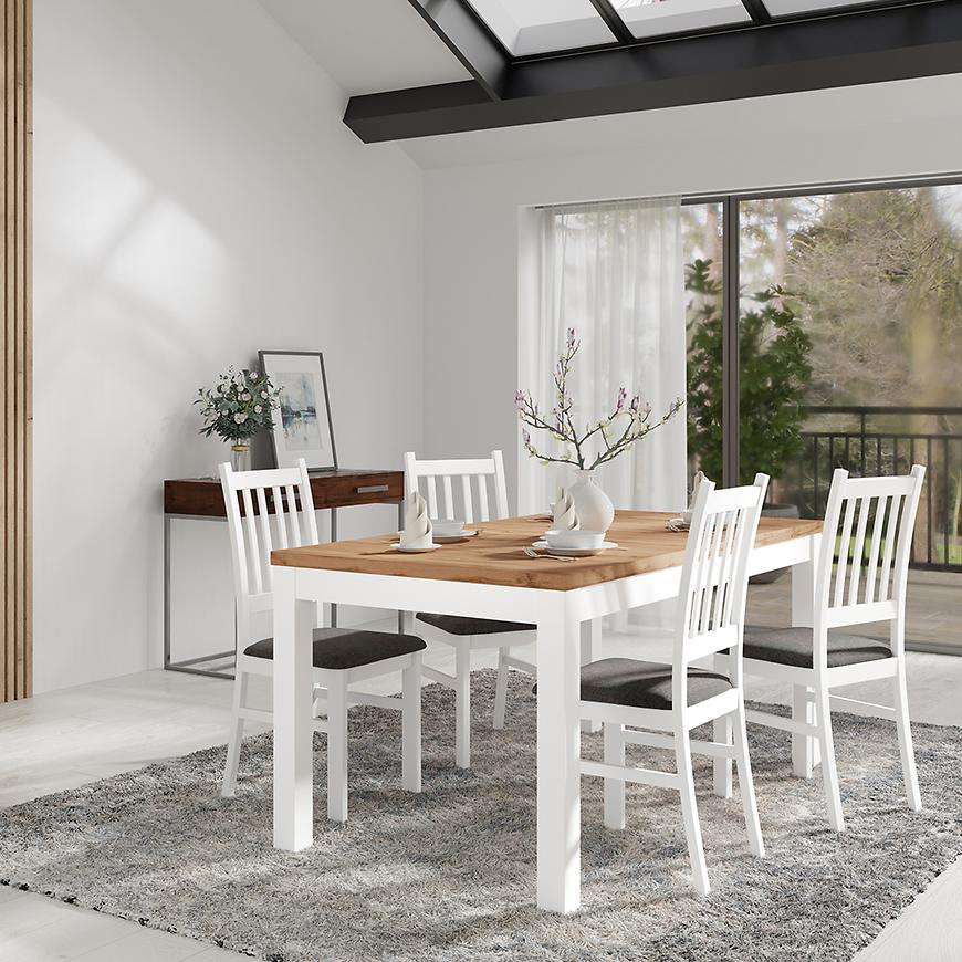 Centralnym punktem zestawu jest prostokątny stół, którego rozkładany blat pozwala na elastyczne dostosowanie przestrzeni do Twoich potrzeb. Przed rozłożeniem świetnie sprawdza się jako codzienny stół do posiłków, natomiast po rozłożeniu oferuje dodatkową przestrzeń, idealną na większe spotkania rodzinne lub towarzyskie. Blat stołu wykończony jest w matowym wybarwieniu, co nadaje mu elegancki, subtelny charakter, jednocześnie ułatwiając utrzymanie go w czystości. Materiał wykonania to połączenie płyty laminowanej i drewna, co zapewnia trwałość oraz odporność na codzienne użytkowanie.