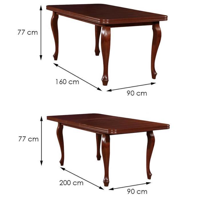 Stół prostokątny, rozkładany: długość 160–200 cm, szerokość 90 cm, wysokość 77 cm