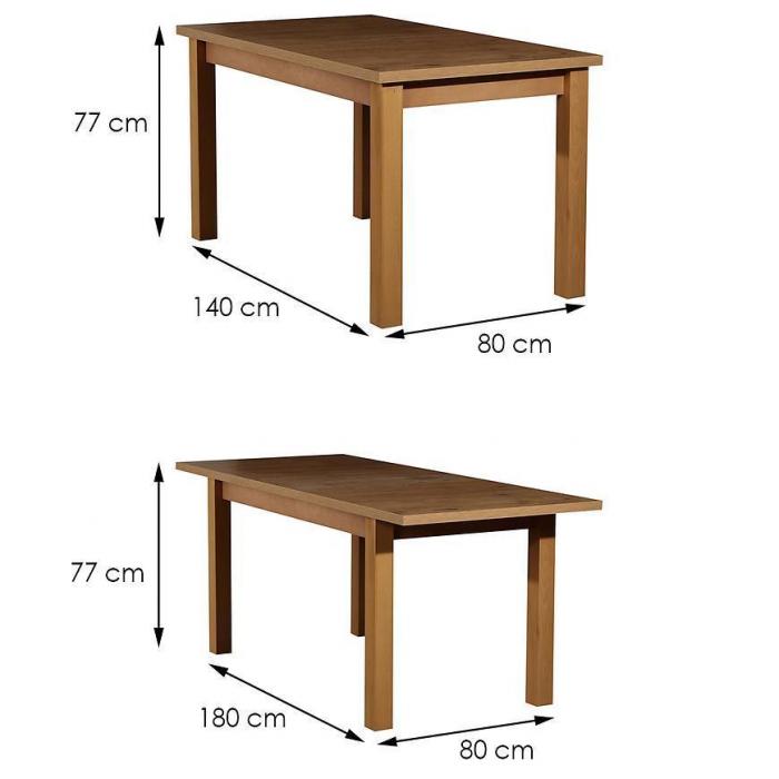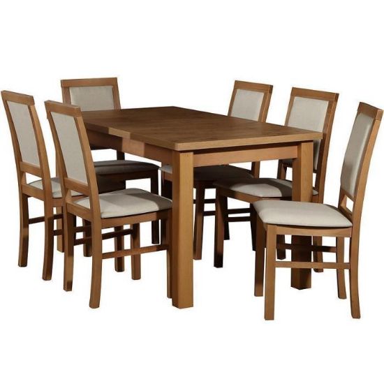 Zestaw stół i krzesła Aurora 1+6 ST28+W98 dąb lancelot to świetny zestaw, który wpasuje się w większość aranżacji. Został wykonany z drewna oraz płyty laminowanej. Konstrukcja zestawu jest solidna oraz wytrzymała. Stół jest rozkładany, przed rozłożeniem jego dlugość wynosi 140cm, natomiast po rozłożeniu - 180cm. Krzesła są bardzo wygodne, siedzisko zostało wypełnione pianką. Wysokość całkowita krzeseł to 93cm, natomiast wysokość do siedziska to 47cm. W zestawie znajduje się 6 krzeseł.