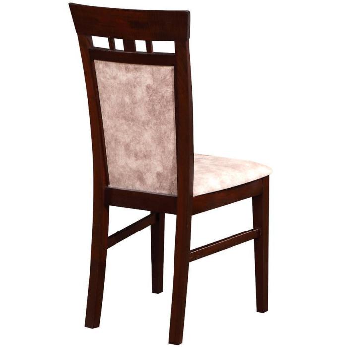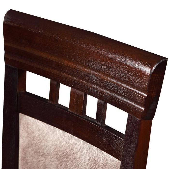 W zestawie znajduje się 6 krzeseł o szerokości 45 cm, głębokości 42 cm i wysokości całkowitej 97 cm, z siedziskiem na wysokości 47 cm. Piankowe siedzisko oraz tapicerka z tkaniny zapewniają komfort podczas długich posiłków. Klasyczne, ciemne wybarwienie drewna doskonale komponuje się z blatem stołu, tworząc spójny i elegancki wygląd jadalni.
