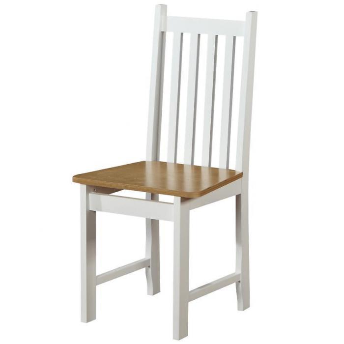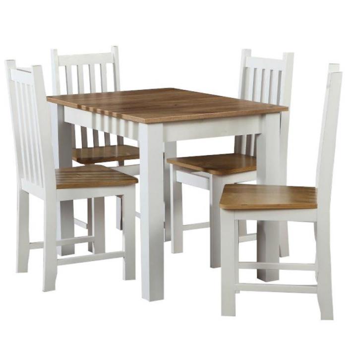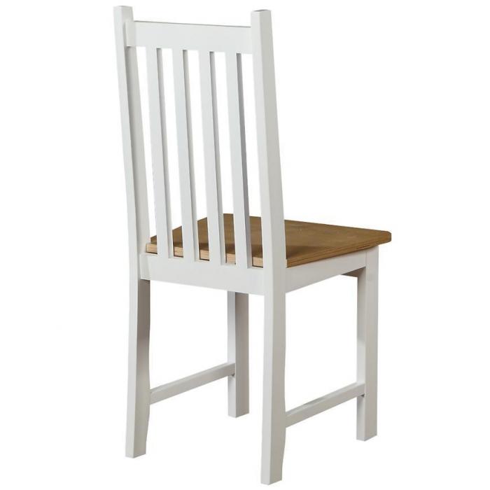Do zestawu dołączone są cztery krzesła Livia, wykonane z drewna, w kolorze dopasowanym do stołu. Wysokość całkowita krzesła wynosi 95 cm, natomiast wysokość siedziska to 45 cm, co zapewnia wygodę podczas długich posiłków. Szerokość siedziska 46 cm i głębokość 38 cm gwarantują komfortowe siedzenie dla dorosłych i dzieci. Krzesła nie posiadają tapicerki, co ułatwia utrzymanie ich w czystości i podkreśla minimalistyczny, nowoczesny charakter zestawu.